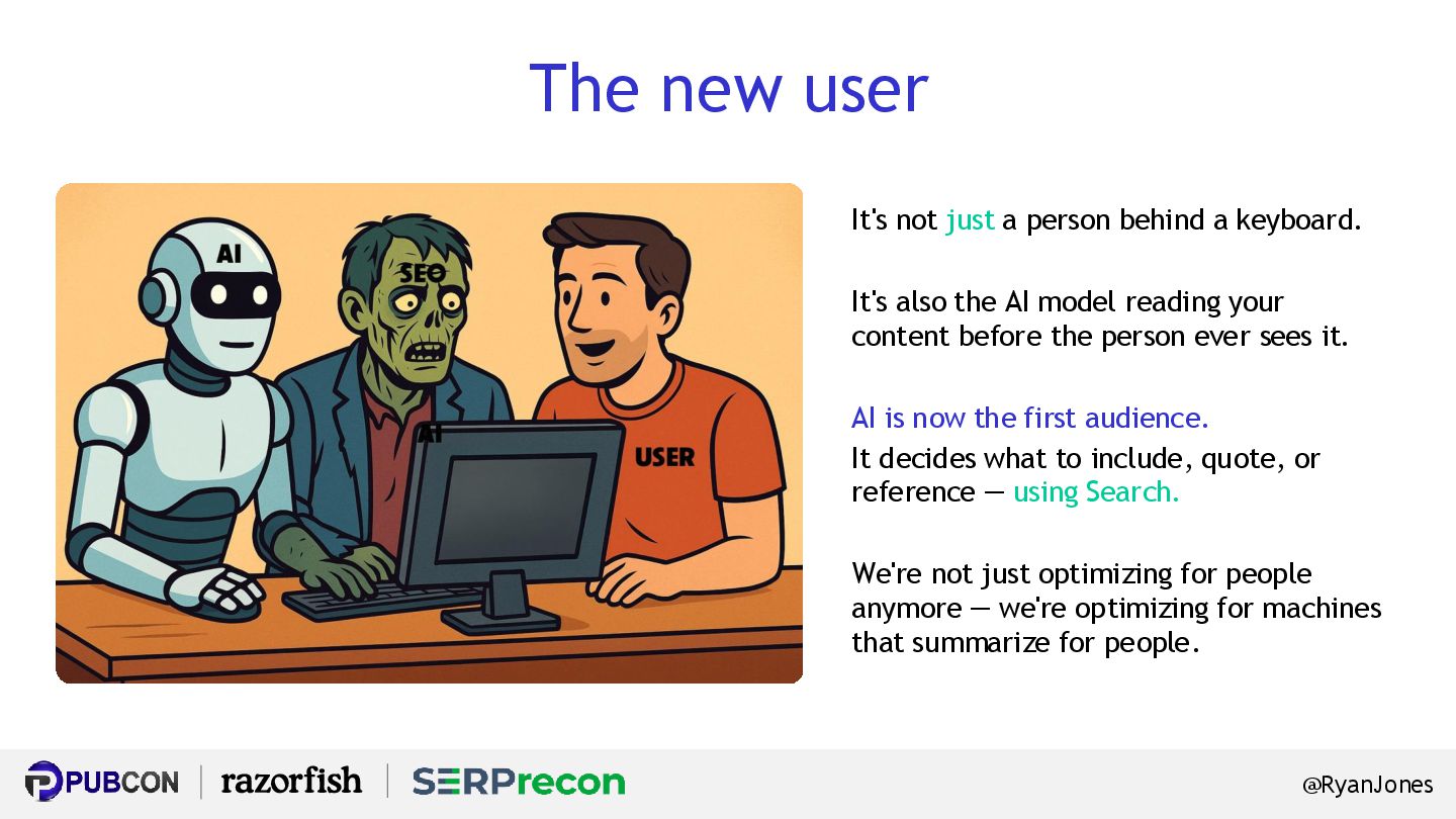 a keyboard. It's also the AI model reading your content before the person ever sees it. AI is now the first audience. It decides what to include, quote, or reference — using Search. We're not just optimizing for people anymore — we're optimizing for machines that summarize for people.