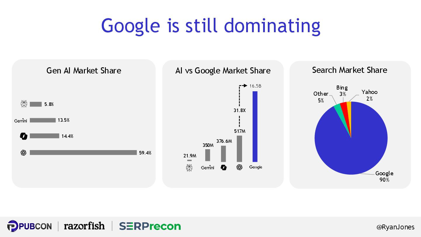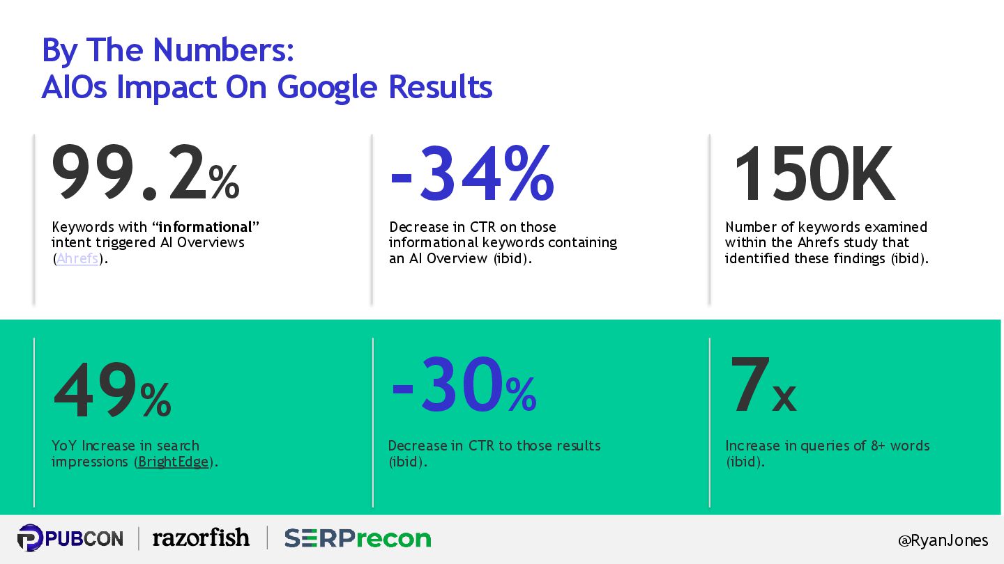 with “informational” intent triggered AI Overviews (Ahrefs). Decrease in CTR on those informational keywords containing an AI Overview (ibid). Number of keywords examined within the Ahrefs study that identified these findings (ibid). YoY Increase in search impressions (BrightEdge). Decrease in CTR to those results (ibid). Increase in queries of 8+ words (ibid). 49% 7x 99.2% -30% -34% 150K