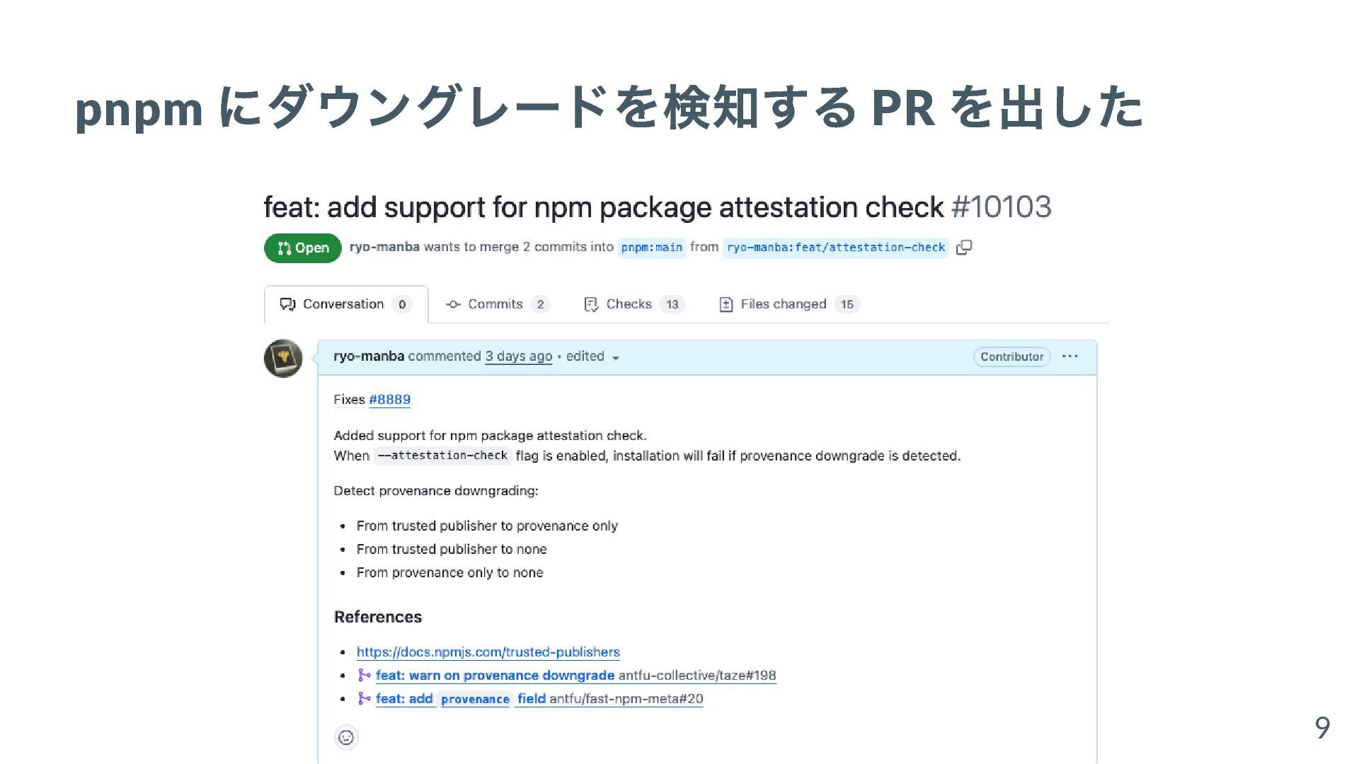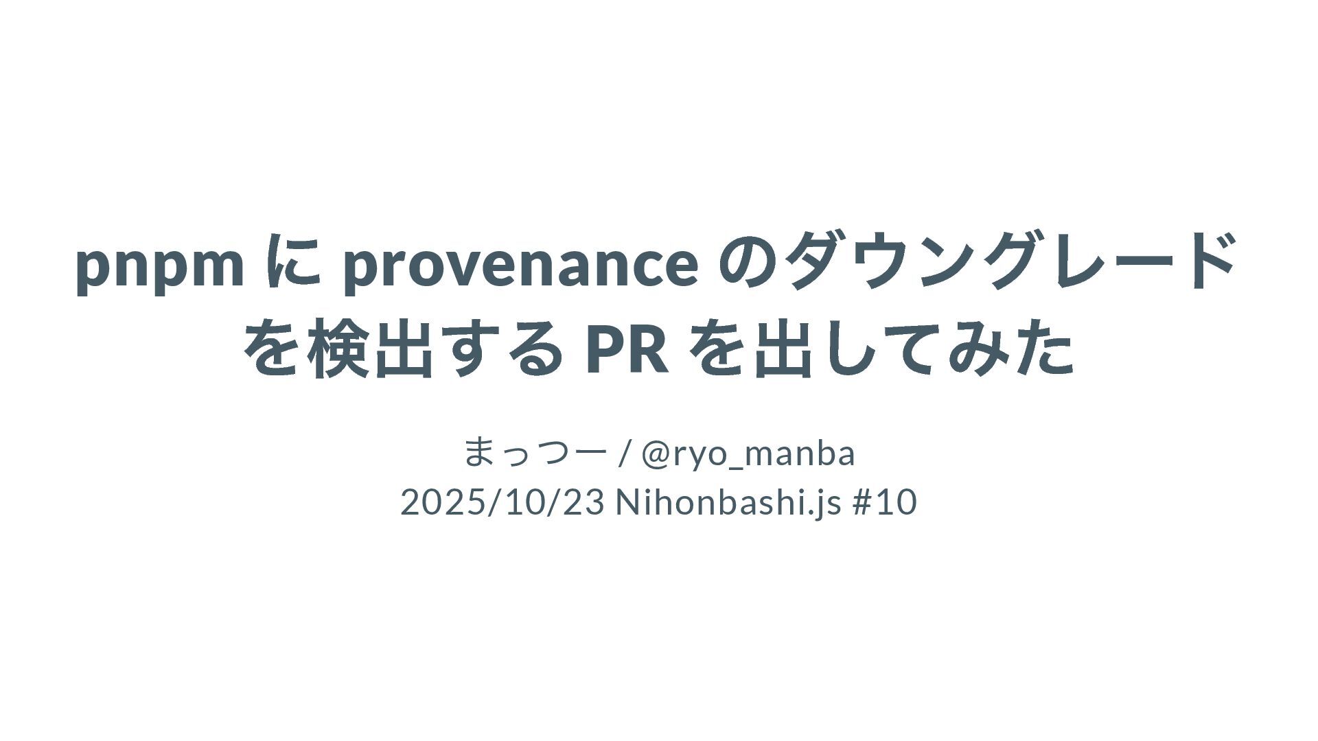 pnpm に provenance のダウングレード を検出する PR を出してみた まっつー / @ryo_manba