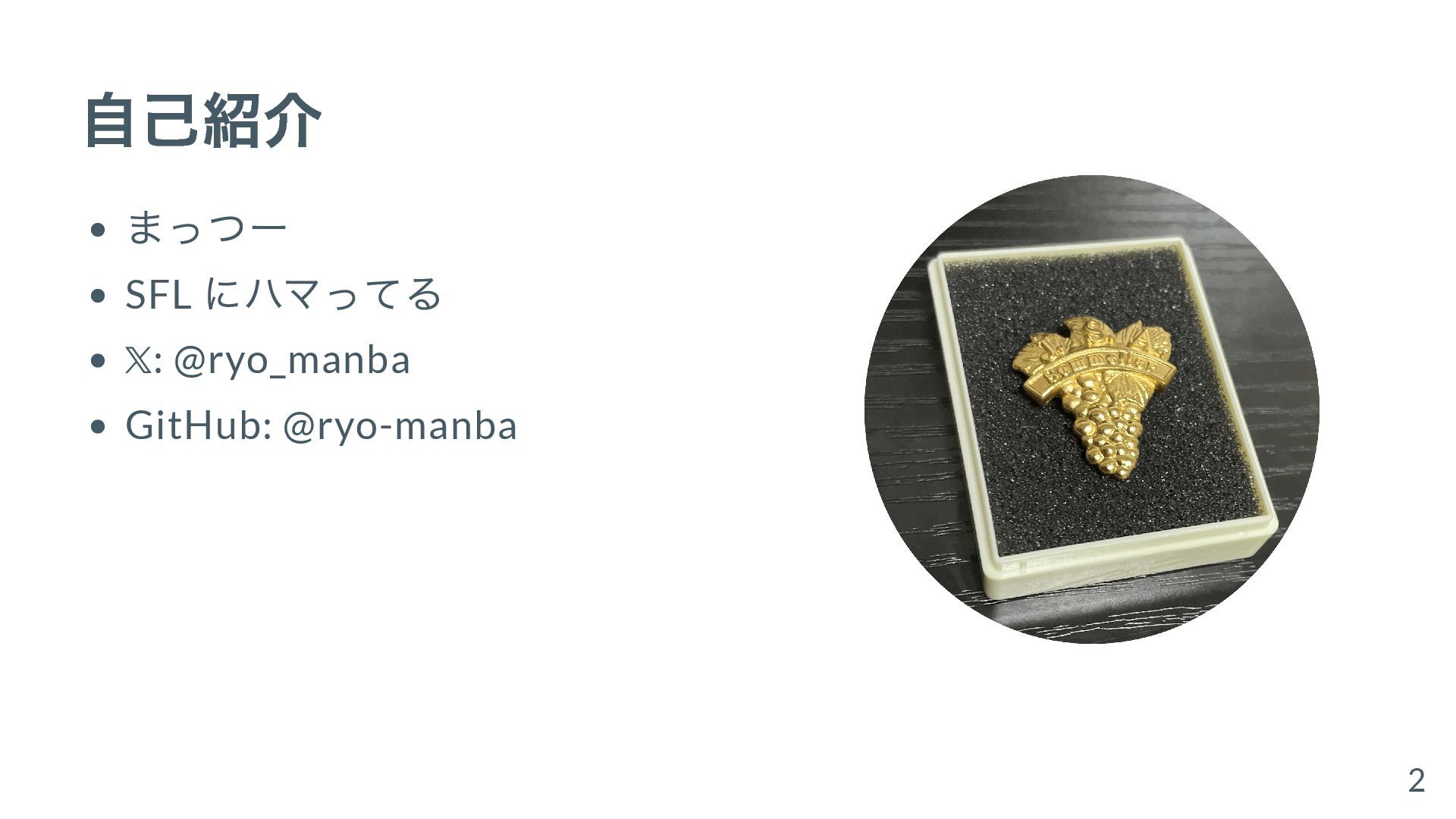 自己紹介 まっつー SFL にハマってる 𝕏: @ryo_manba GitHub: @ryo-manba 2