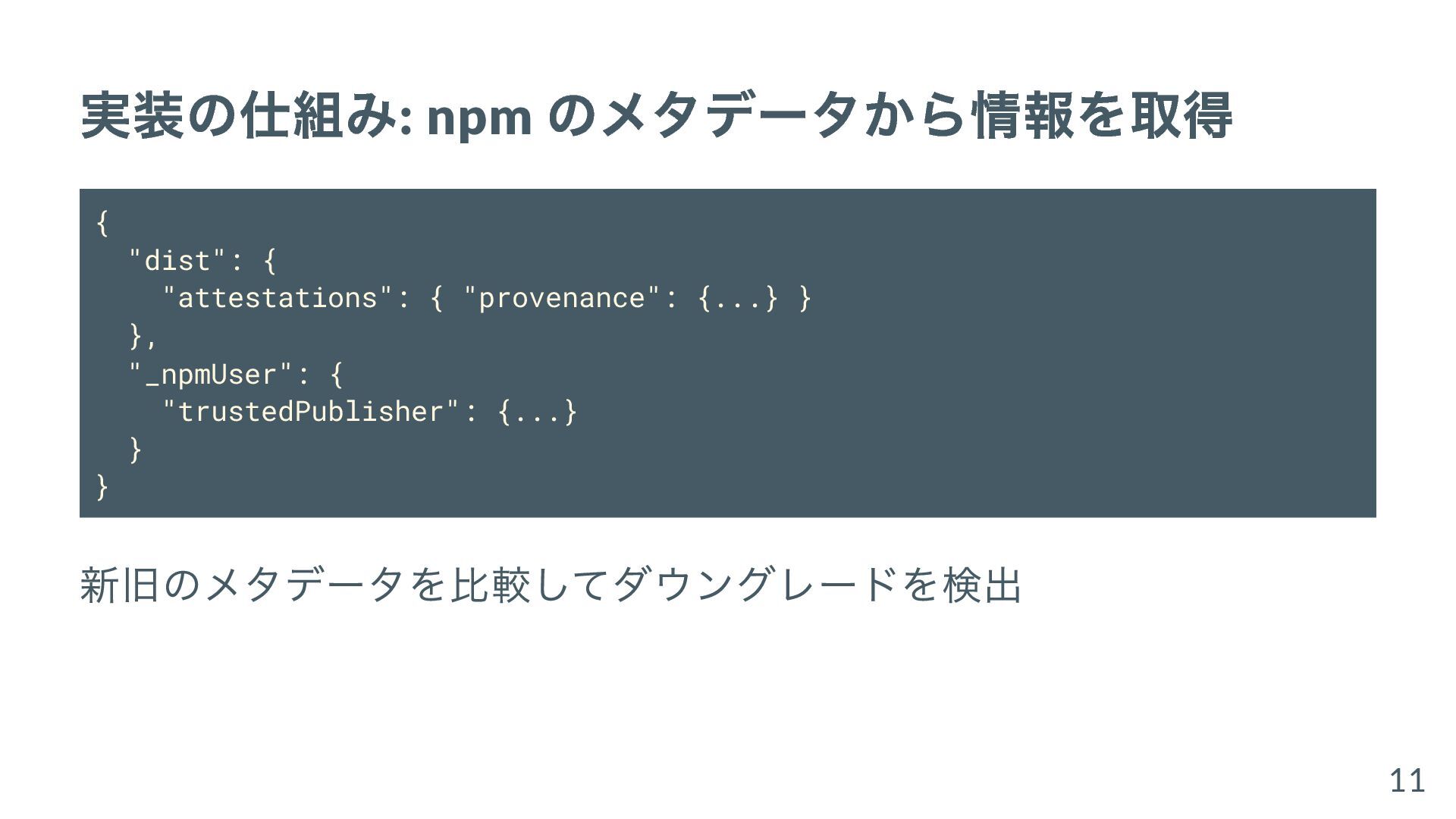 実装の仕組み: npm のメタデータから情報を取得 { "dist": { "attestations": { "provenance": {...}