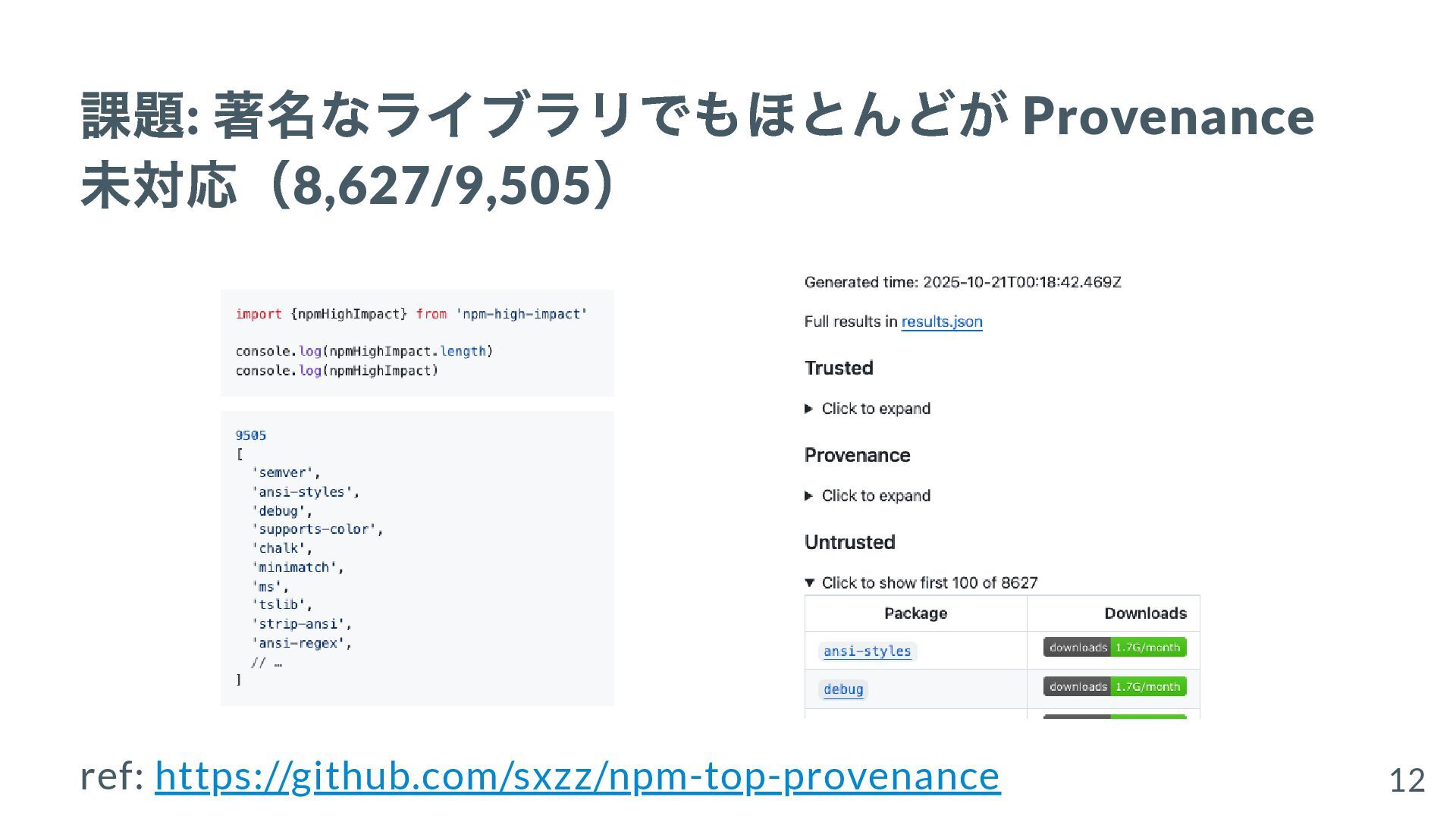 課題: 著名なライブラリでもほとんどが Provenance 未対応(8,627/9,505 ) ref: https://github.com/sxzz/npm-top-provenance 12