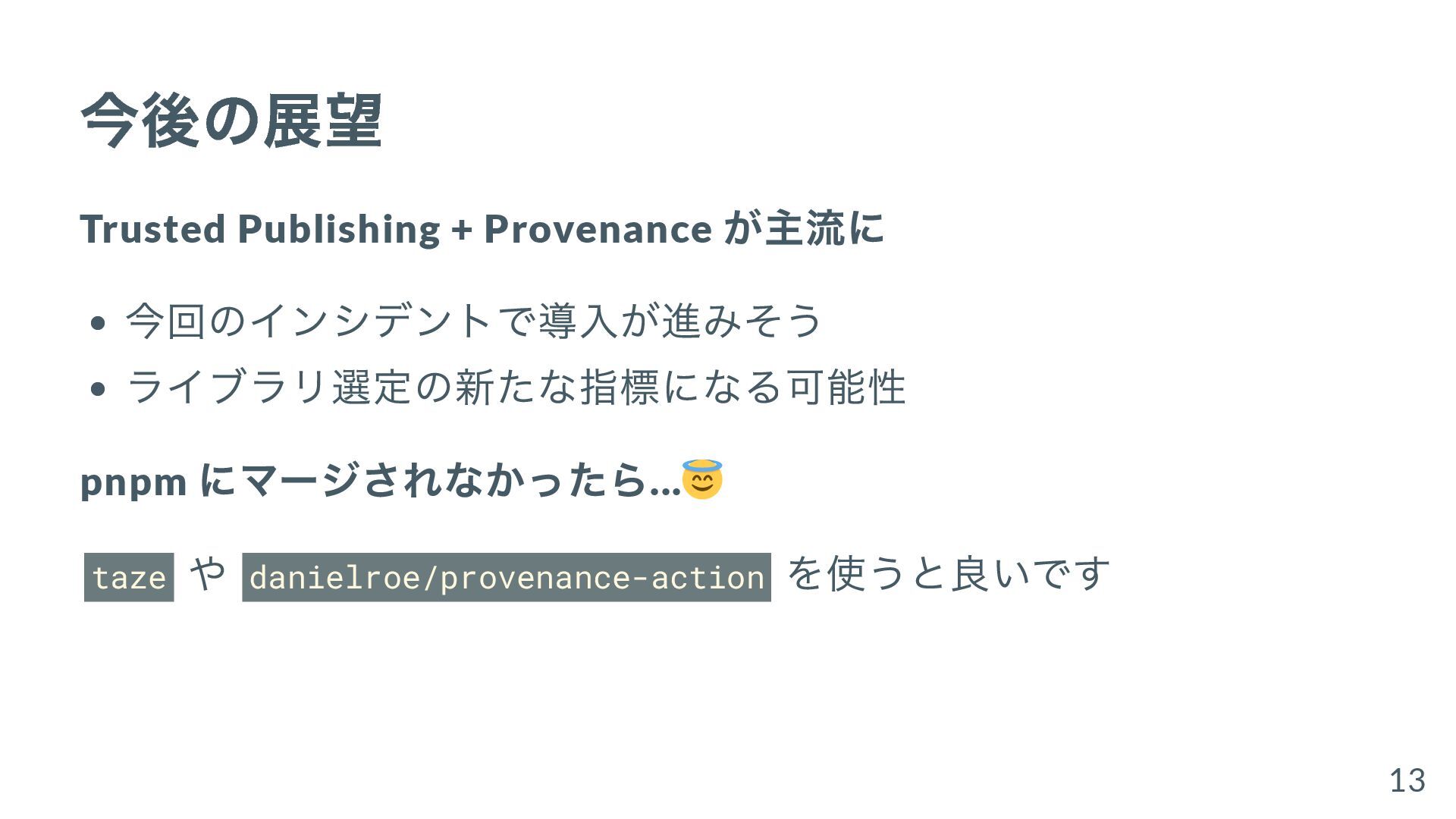 今後の展望 Trusted Publishing + Provenance が主流に 今回のインシデントで導入が進みそう ライブラリ選定の新たな指標になる可能性 pnpm にマージされなかったら...
