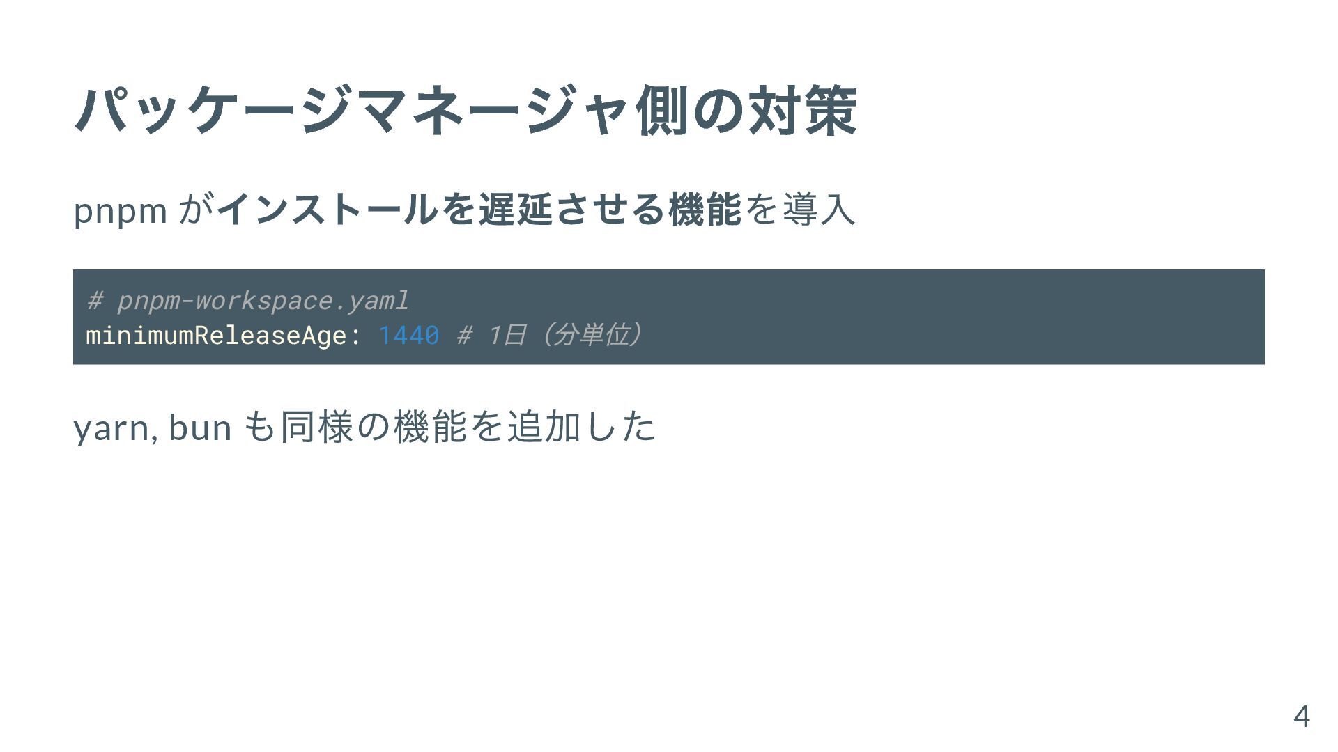 パッケージマネージャ側の対策 pnpm がインストールを遅延させる機能を導入 # pnpm-workspace.yaml minimumReleaseAge: 1440 # 1 日(分単位)