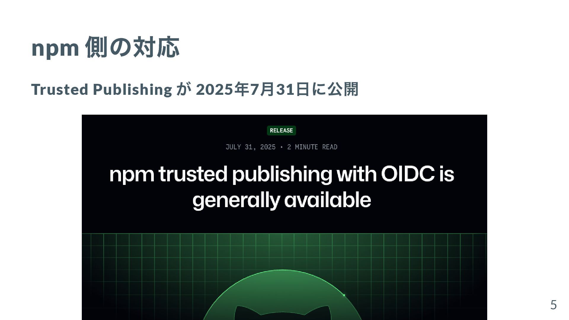 npm 側の対応 Trusted Publishing が 2025 年7 月31 日に公開 5