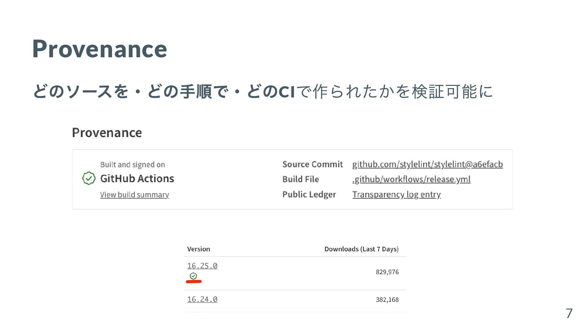 Provenance どのソースを・どの手順で・どのCI で作られたかを検証可能に 7