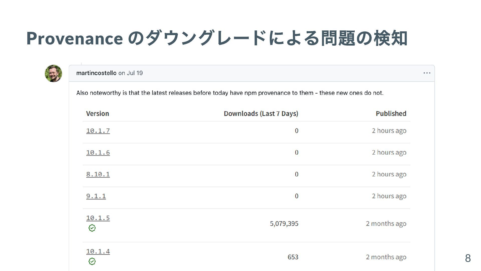 } }, "_npmUser": { "trustedPublisher": {...} } } 新旧のメタデータを比較してダウングレードを検出 11