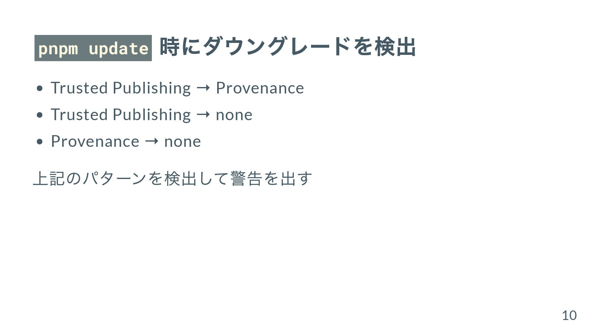 pnpm update 時にダウングレードを検出 Trusted Publishing → Provenance Trusted Publishing →