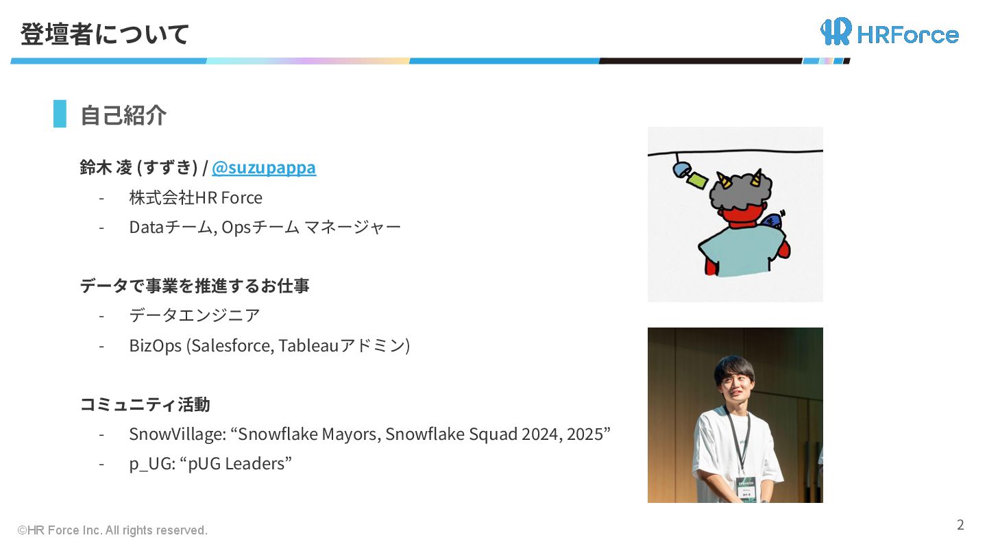 (すずき) / @suzupappa - 株式会社HR Force - Dataチーム, Opsチーム マネージャー データで事業を推進するお仕事 - データエンジニア - BizOps (Salesforce, Tableauアドミン) コミュニティ活動 - SnowVillage: “Snowflake Mayors, Snowflake Squad 2024, 2025” - p_UG: “pUG Leaders” ⾃⼰紹介