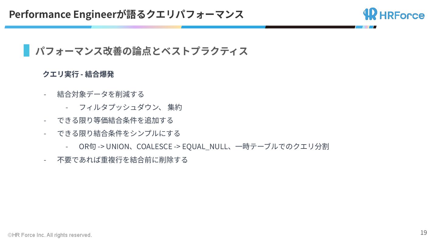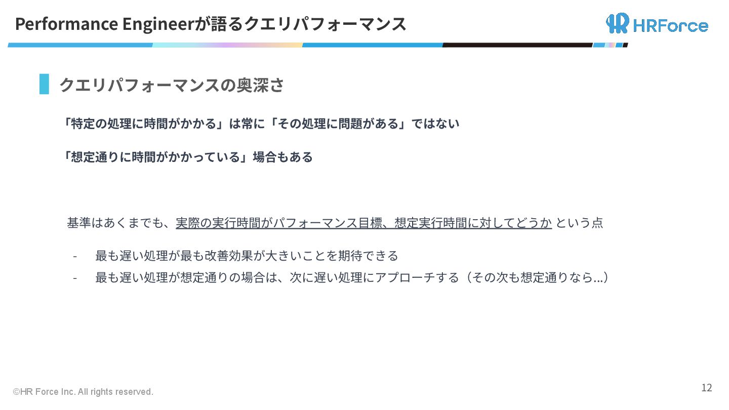 12. ©HR Force Inc. All rights reserved. 19 Performance Engineerが語るクエリパフォーマンス パフォーマンス改善の論点とベストプラクティス