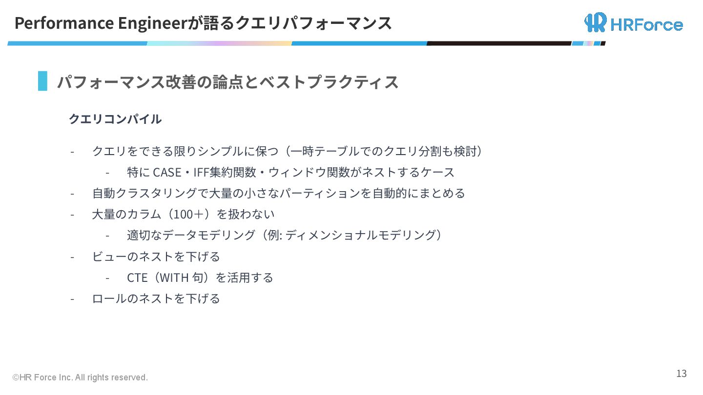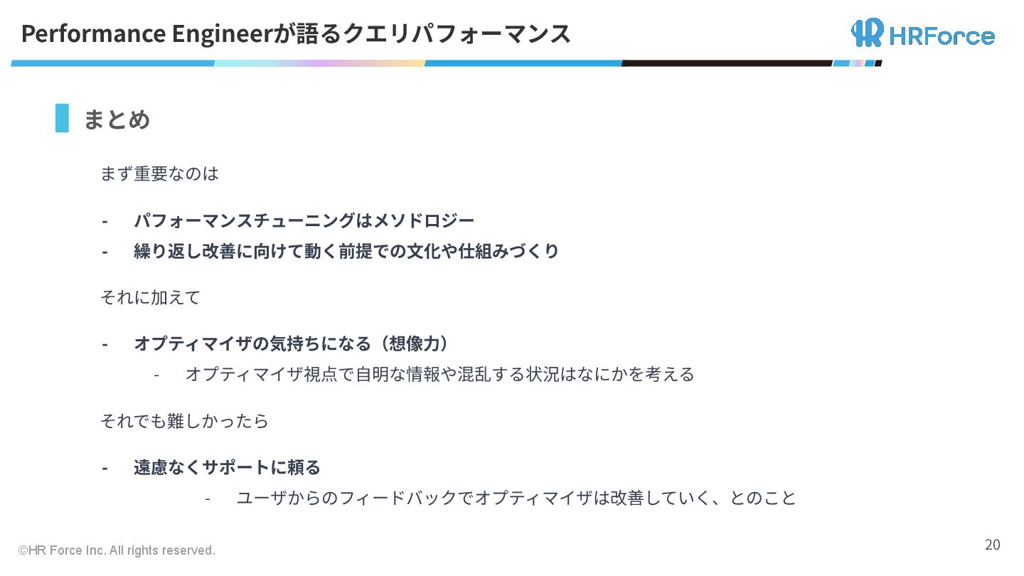 13. ©HR Force Inc. All rights reserved. 20 Performance Engineerが語るクエリパフォーマンス まとめ