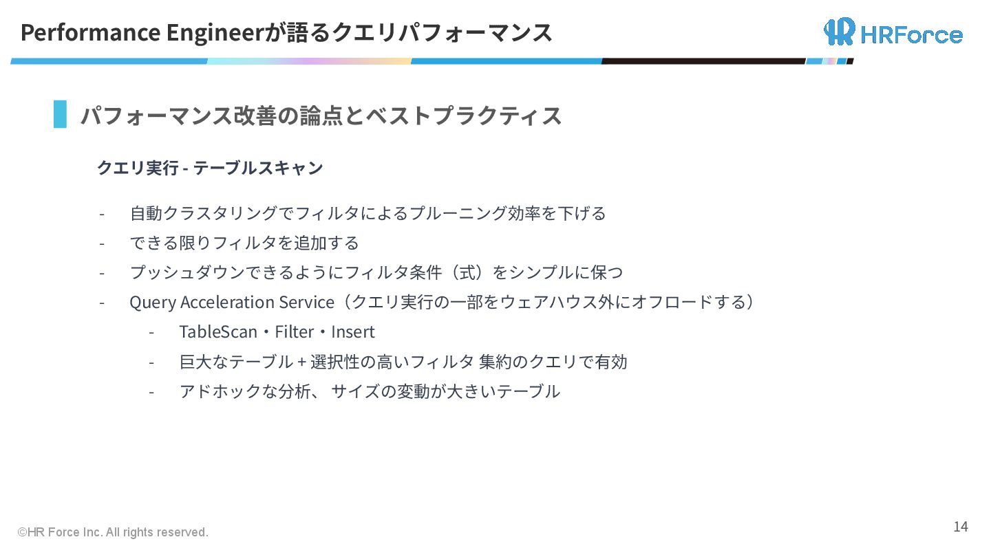 6. ©HR Force Inc. All rights reserved. 13 Performance Engineerが語るクエリパフォーマンス パフォーマンス改善の論点とベストプラクティス
