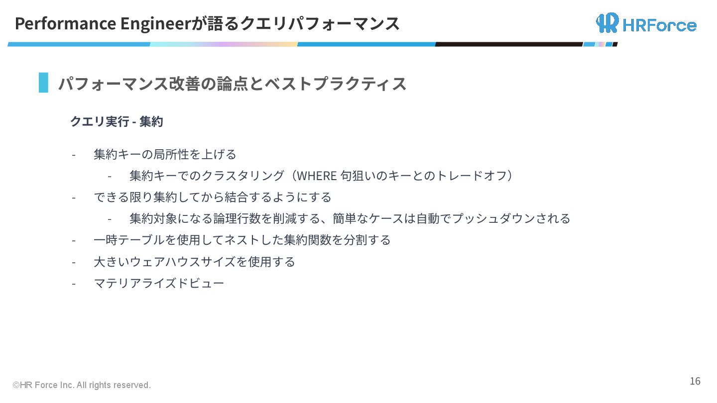 8. ©HR Force Inc. All rights reserved. 15 Performance Engineerが語るクエリパフォーマンス パフォーマンス改善の論点とベストプラクティス