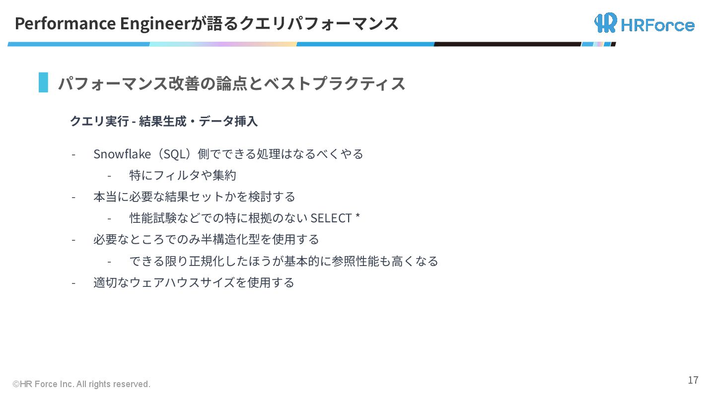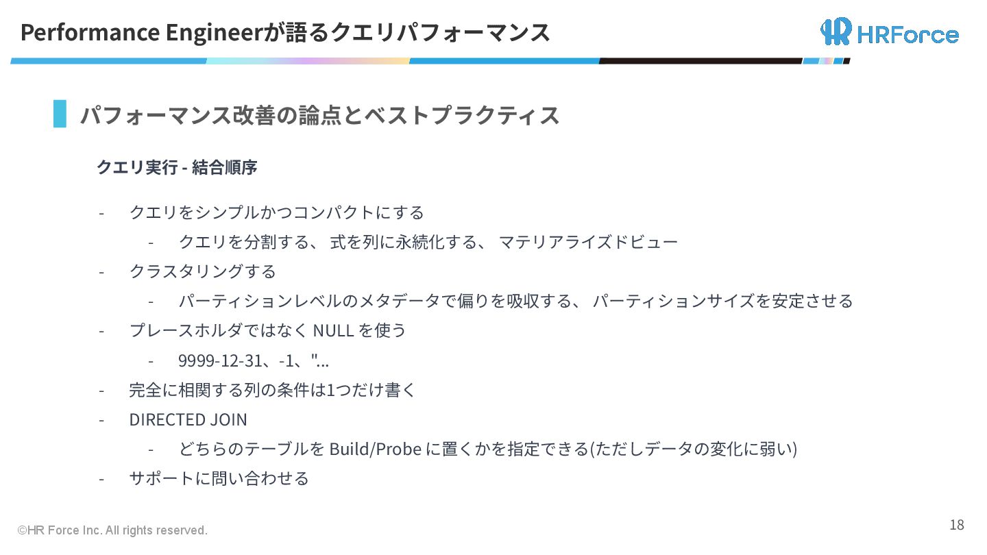 10. ©HR Force Inc. All rights reserved. 17 Performance Engineerが語るクエリパフォーマンス パフォーマンス改善の論点とベストプラクティス
