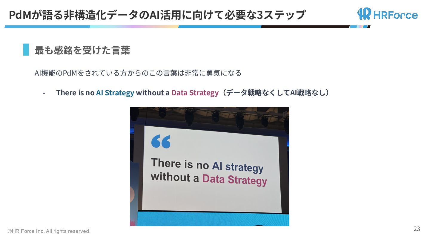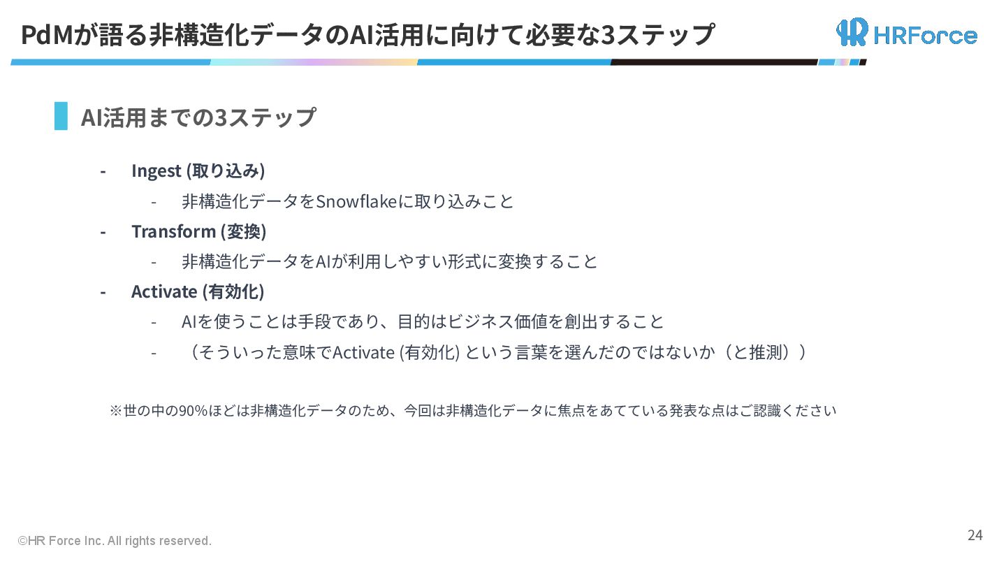 14. ©HR Force Inc. All rights reserved. 24 PdMが語る⾮構造化データのAI活⽤に向けて必要な3ステップ AI活⽤までの3ステップ -