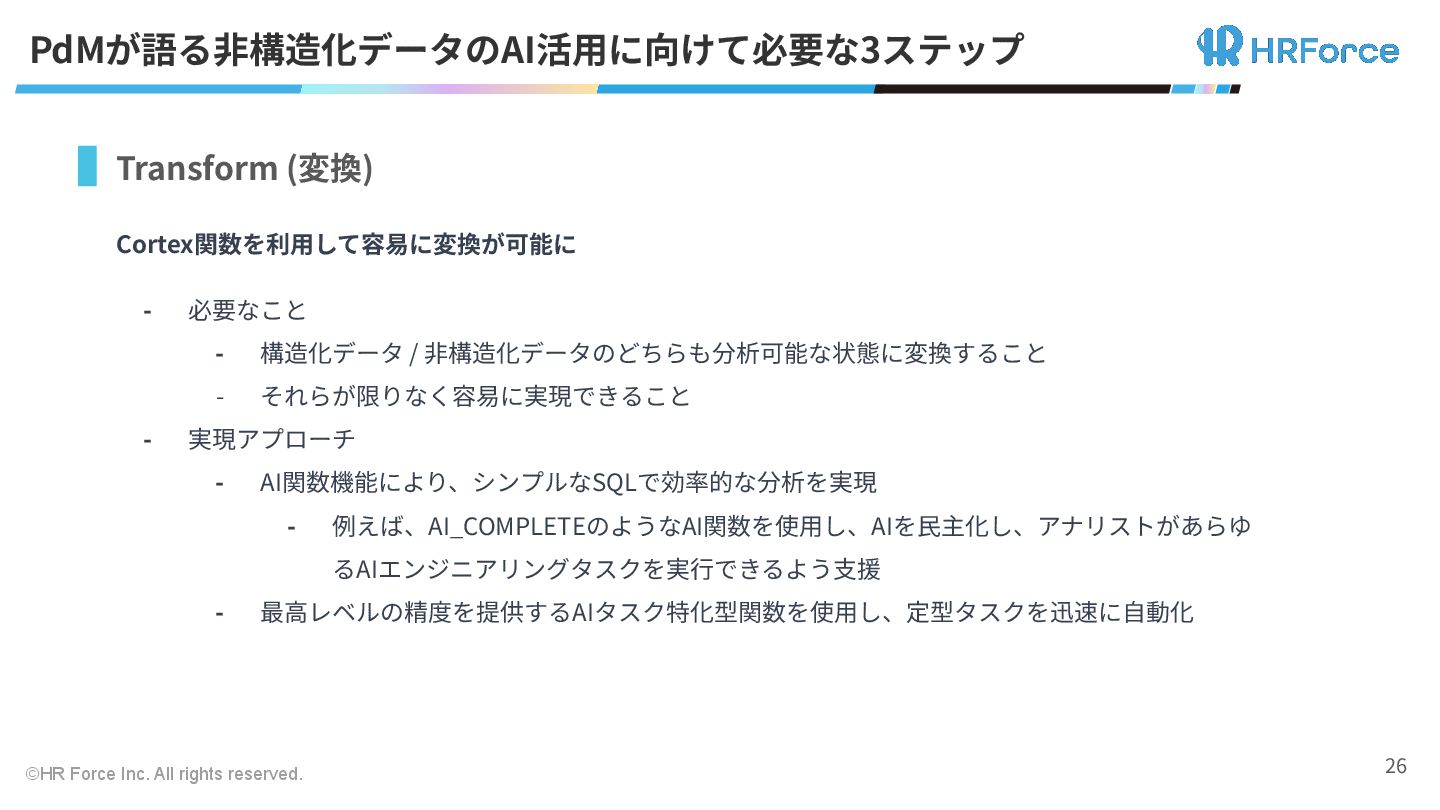 16. ©HR Force Inc. All rights reserved. 26 PdMが語る⾮構造化データのAI活⽤に向けて必要な3ステップ Transform (変換)