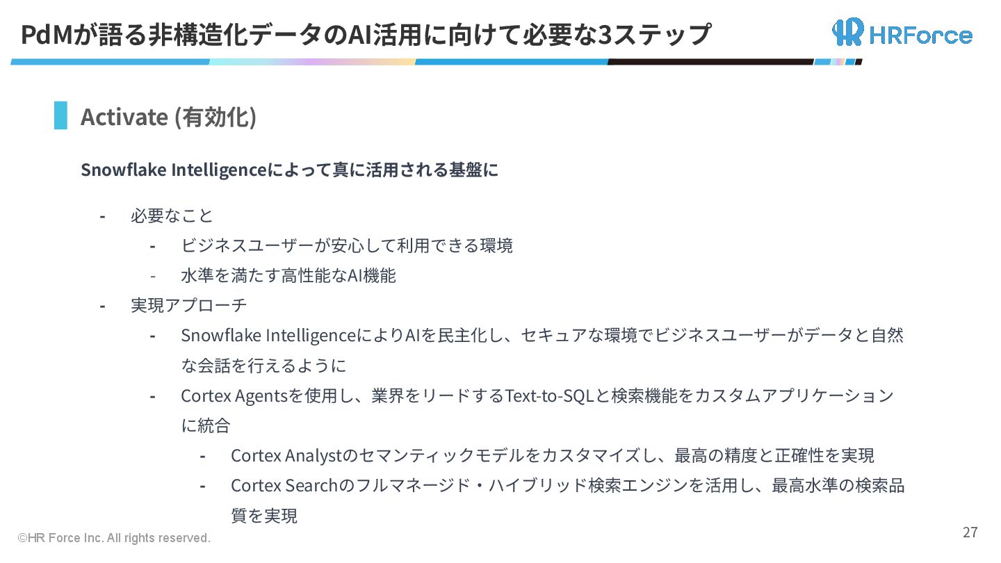 17. ©HR Force Inc. All rights reserved. 27 PdMが語る⾮構造化データのAI活⽤に向けて必要な3ステップ Activate (有効化)