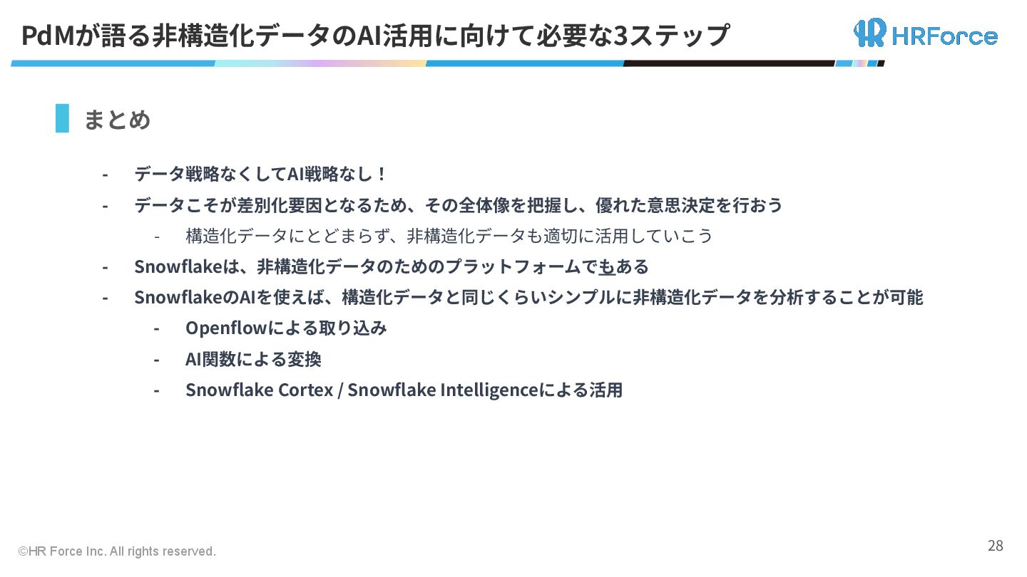 データ戦略なくしてAI戦略なし! - データこそが差別化要因となるため、その全体像を把握し、優れた意思決定を⾏おう - 構造化データにとどまらず、⾮構造化データも適切に活⽤していこう - Snowflakeは、⾮構造化データのためのプラットフォームでもある - SnowflakeのAIを使えば、構造化データと同じくらいシンプルに⾮構造化データを分析することが可能 - Openflowによる取り込み - AI関数による変換 - Snowflake Cortex / Snowflake Intelligenceによる活⽤