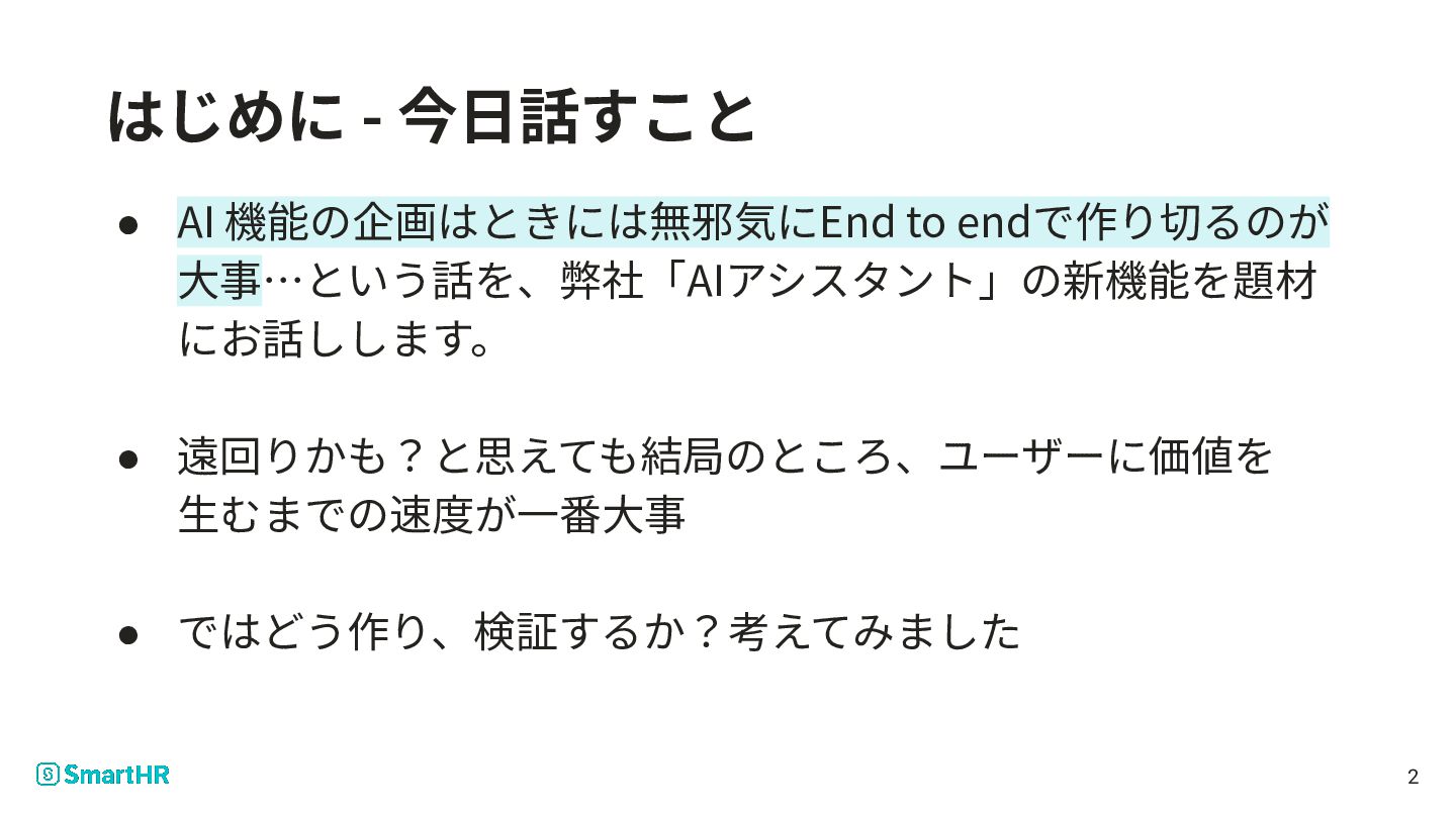 はじめに - 今⽇話すこと 2 • AI 機能の企画はときには無邪気にEnd to endで作り切るのが ⼤事…という話を、弊社「AIアシスタント」の新機能を題材