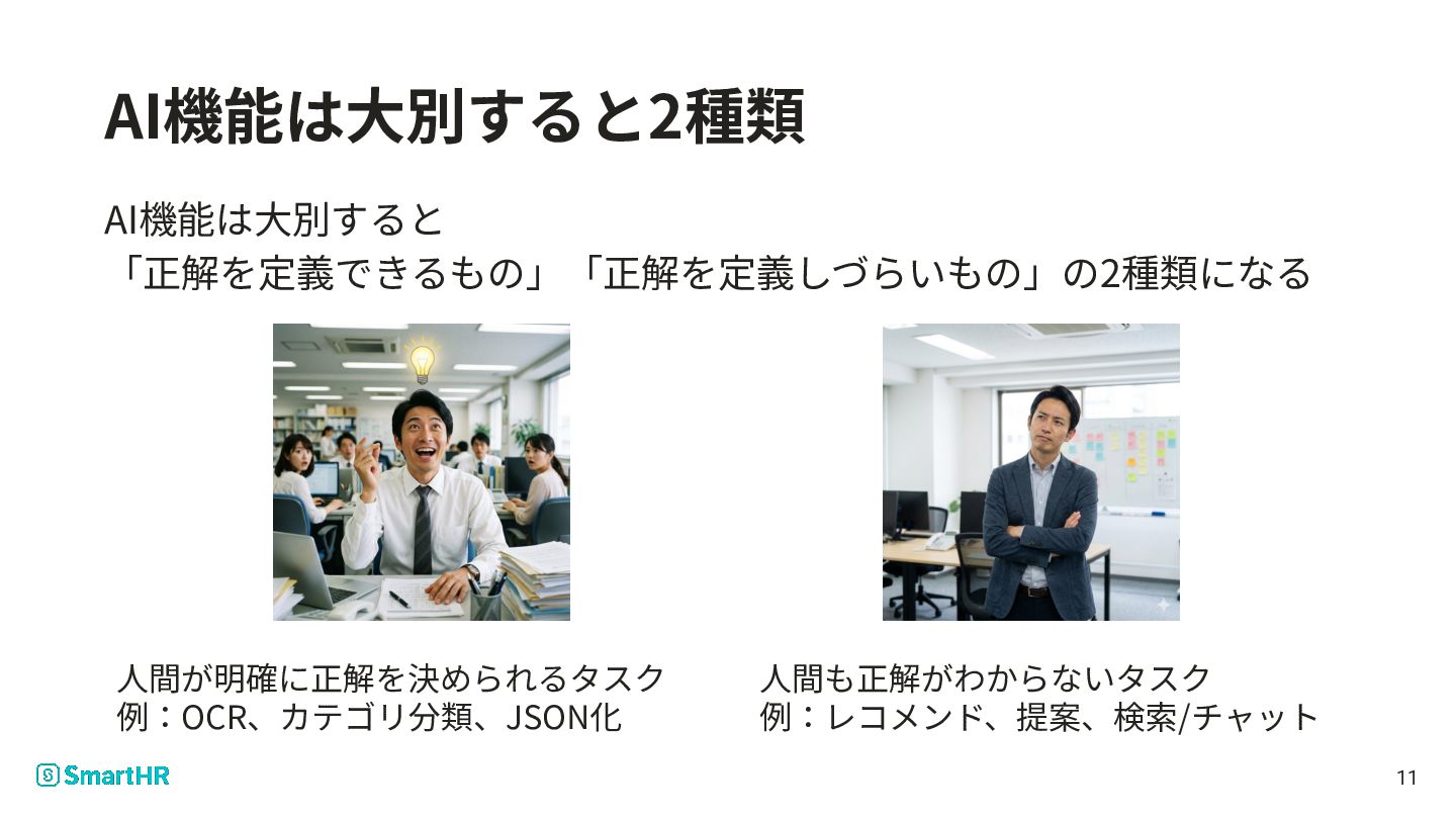 11 AI機能は⼤別すると2種類 ⼈間が明確に正解を決められるタスク 例:OCR、カテゴリ分類、JSON化 ⼈間も正解がわからないタスク 例:レコメンド、提案、検索/チャット AI機能は⼤別すると 「正解を定義できるもの」「正解を定義しづらいもの」の2種類になる