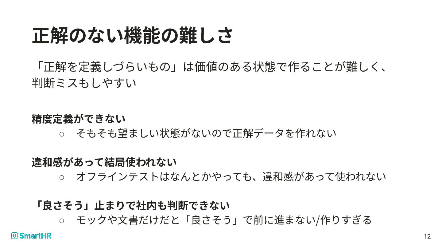 12 正解のない機能の難しさ 「正解を定義しづらいもの」は価値のある状態で作ることが難しく、 判断ミスもしやすい 精度定義ができない ◦ そもそも望ましい状態がないので正解データを作れない 違和感があって結局使われない ◦ オフラインテストはなんとかやっても、違和感があって使われない