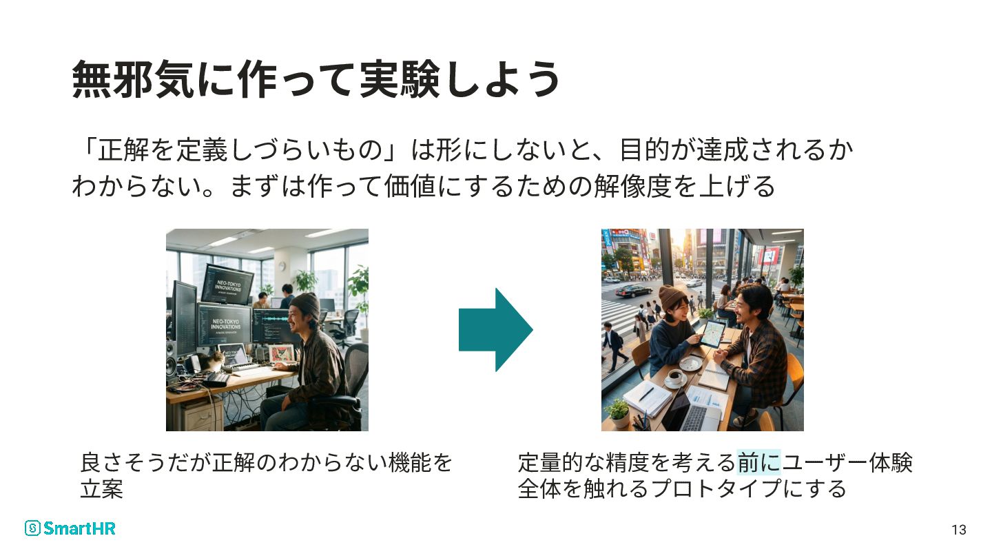 13 無邪気に作って実験しよう 「正解を定義しづらいもの」は形にしないと、⽬的が達成されるか わからない。まずは作って価値にするための解像度を上げる 良さそうだが正解のわからない機能を ⽴案 定量的な精度を考える前にユーザー体験 全体を触れるプロトタイプにする