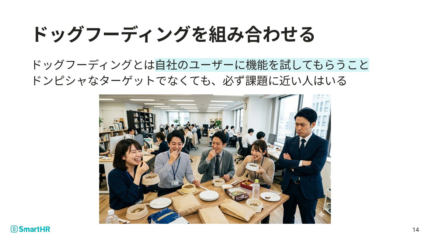 14 ドッグフーディングを組み合わせる ドッグフーディングとは⾃社のユーザーに機能を試してもらうこと ドンピシャなターゲットでなくても、必ず課題に近い⼈はいる