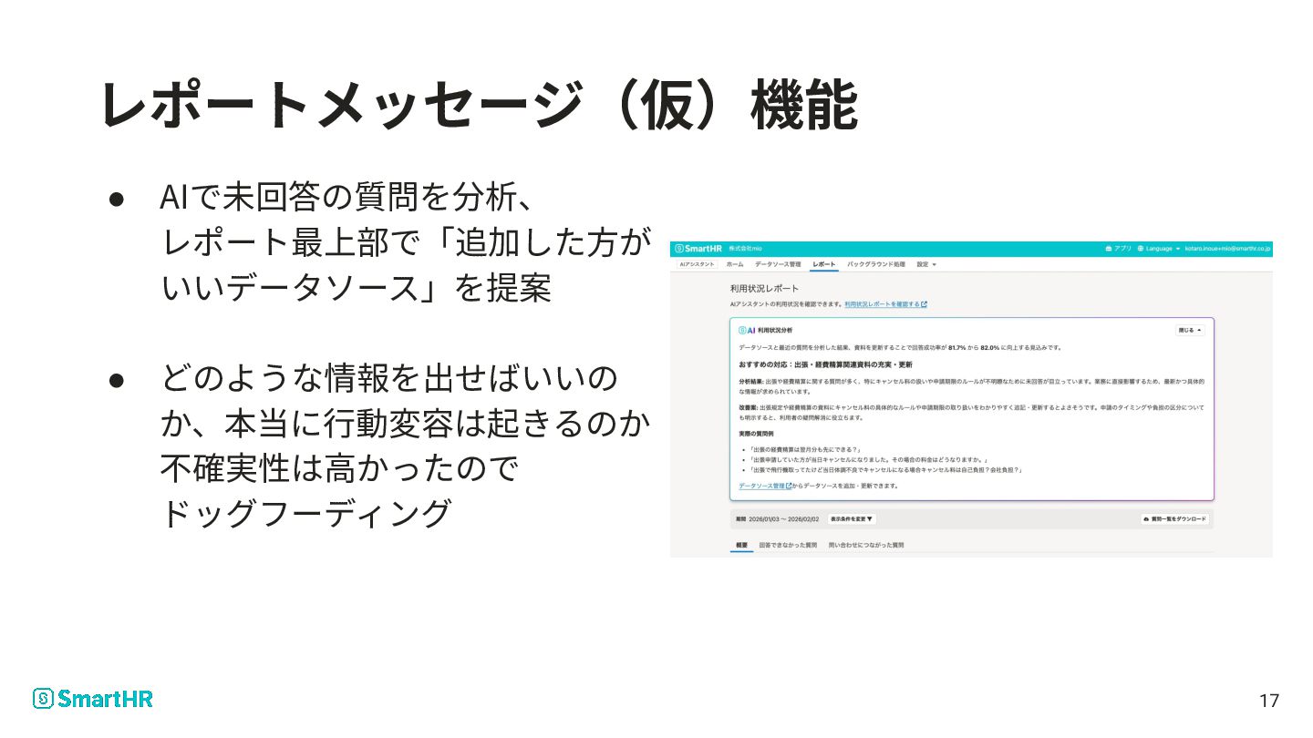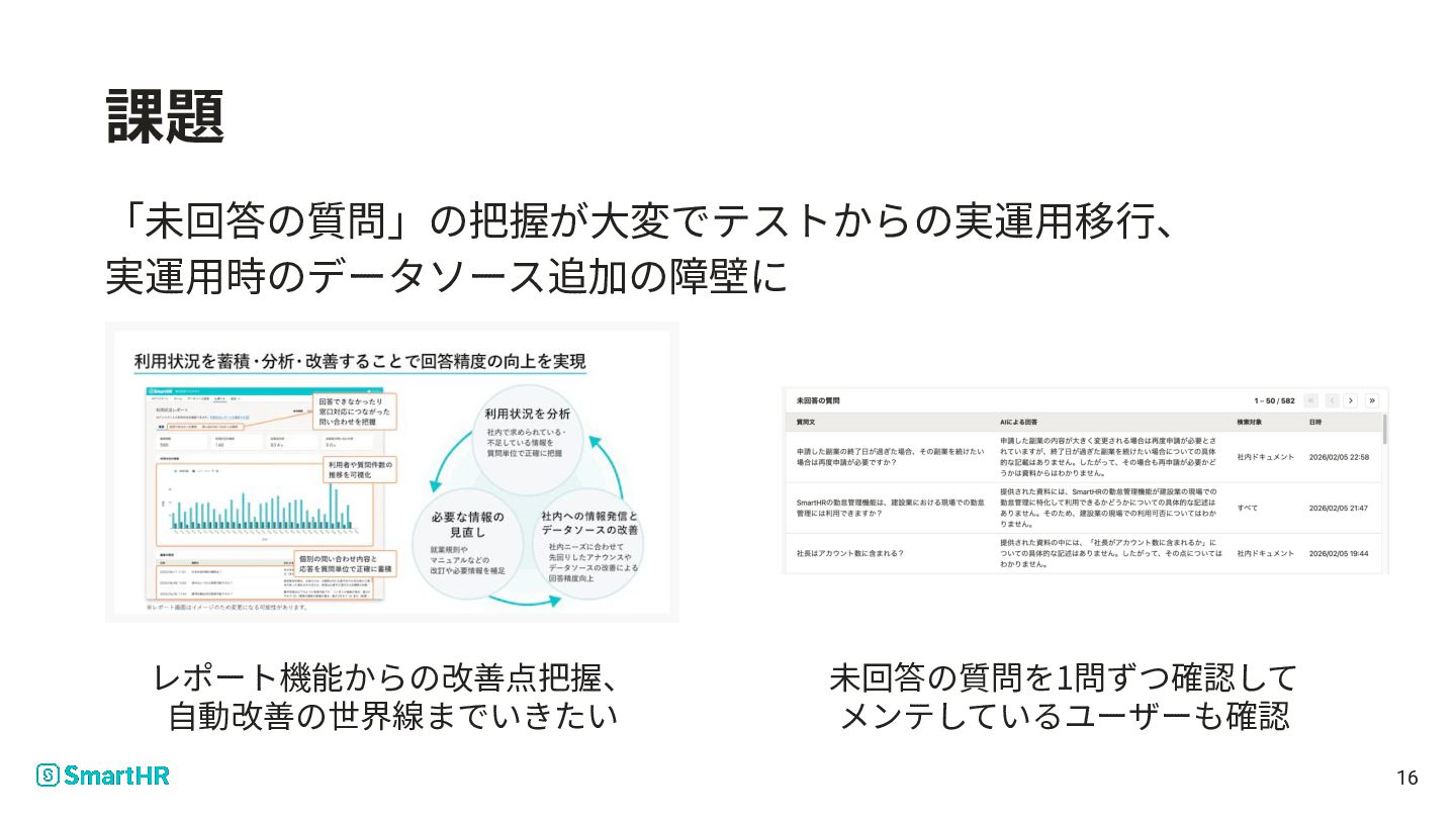 課題 16 「未回答の質問」の把握が⼤変でテストからの実運⽤移⾏、 実運⽤時のデータソース追加の障壁に レポート機能からの改善点把握、 ⾃動改善の世界線までいきたい 未回答の質問を1問ずつ確認して メンテしているユーザーも確認