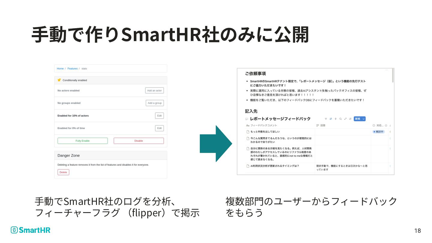 ⼿動で作りSmartHR社のみに公開 18 ⼿動でSmartHR社のログを分析、 フィーチャーフラグ (flipper)で掲⽰ 複数部⾨のユーザーからフィードバック をもらう