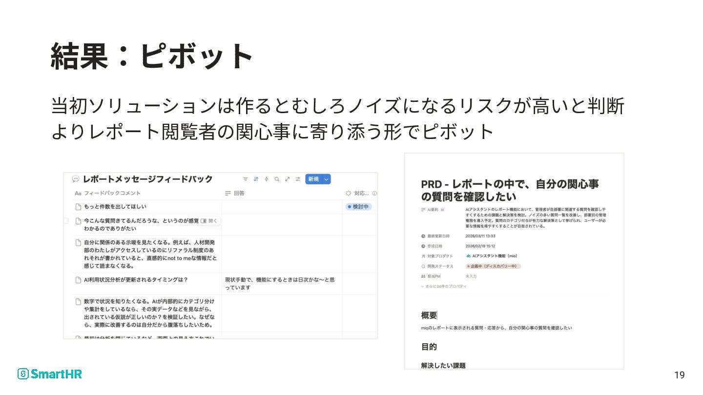 結果:ピボット 19 当初ソリューションは作るとむしろノイズになるリスクが⾼いと判断 よりレポート閲覧者の関⼼事に寄り添う形でピボット