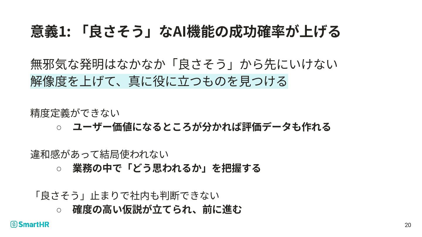 業務の中で「どう思われるか」を把握する 「良さそう」⽌まりで社内も判断できない ◦ 確度の⾼い仮説が⽴てられ、前に進む