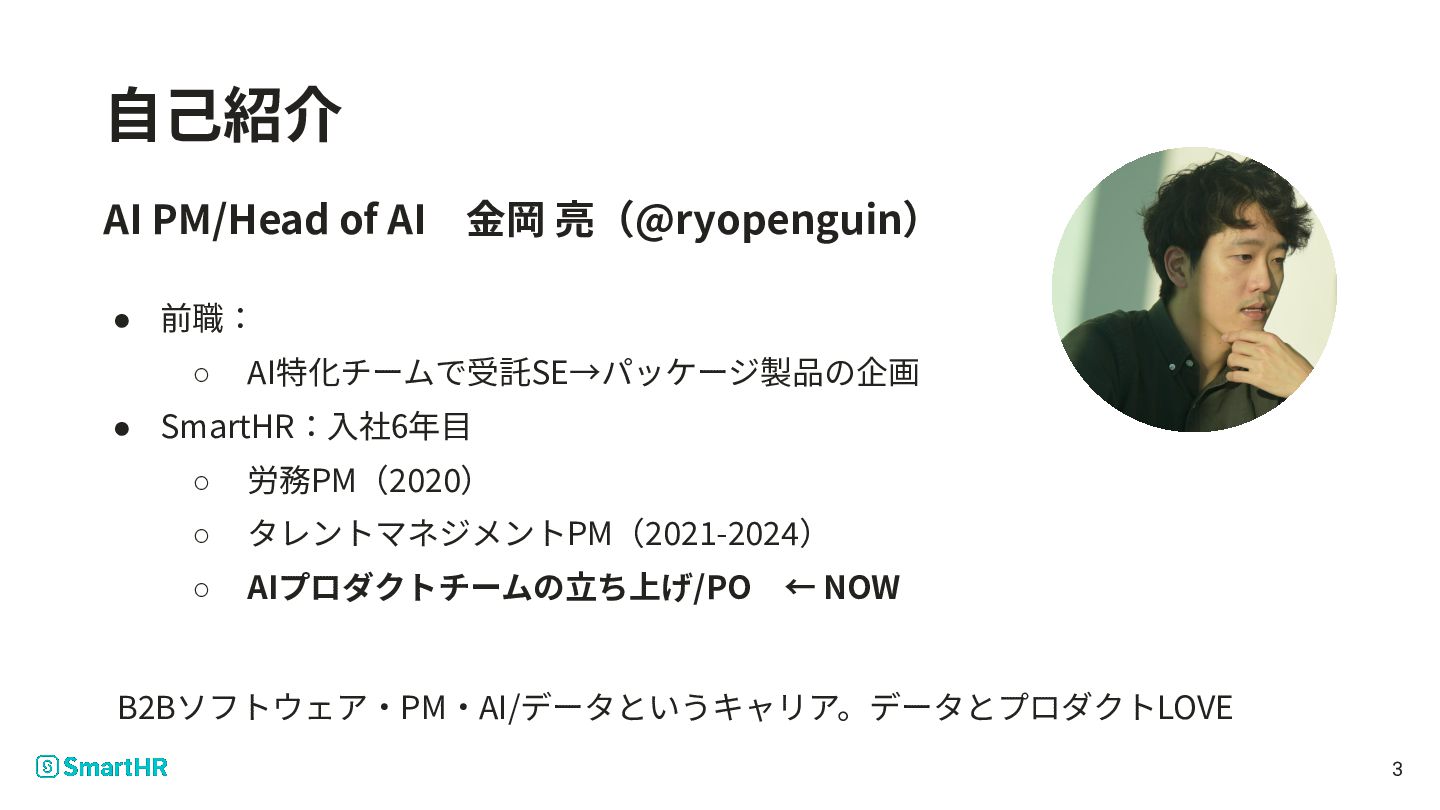 AI特化チームで受託SE→パッケージ製品の企画 • SmartHR:⼊社6年⽬ ◦ 労務PM(2020) ◦ タレントマネジメントPM(2021-2024) ◦ AIプロダクトチームの⽴ち上げ/PO ← NOW B2Bソフトウェア‧PM‧AI/データというキャリア。データとプロダクトLOVE