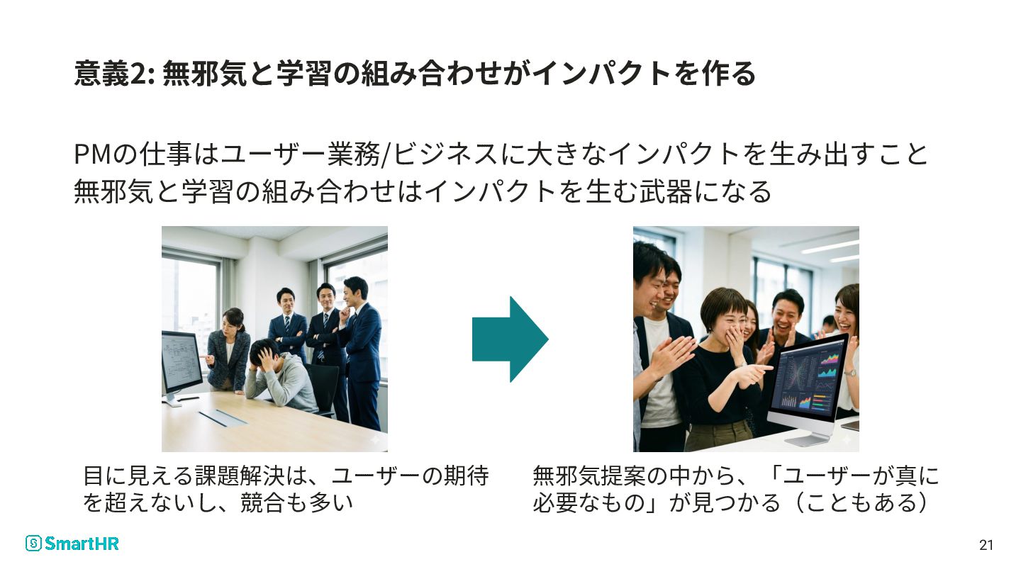 意義2: 無邪気と学習の組み合わせがインパクトを作る 21 PMの仕事はユーザー業務/ビジネスに⼤きなインパクトを⽣み出すこと 無邪気と学習の組み合わせはインパクトを⽣む武器になる ⽬に⾒える課題解決は、ユーザーの期待 を超えないし、競合も多い 無邪気提案の中から、「ユーザーが真に 必要なもの」が⾒つかる(こともある)