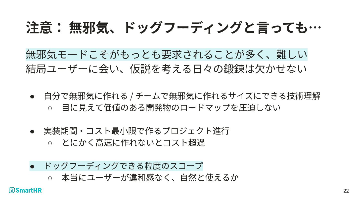 注意: 無邪気、ドッグフーディングと⾔っても… 22 無邪気モードこそがもっとも要求されることが多く、難しい 結局ユーザーに会い、仮説を考える⽇々の鍛錬は⽋かせない • ⾃分で無邪気に作れる / チームで無邪気に作れるサイズにできる技術理解 ◦
