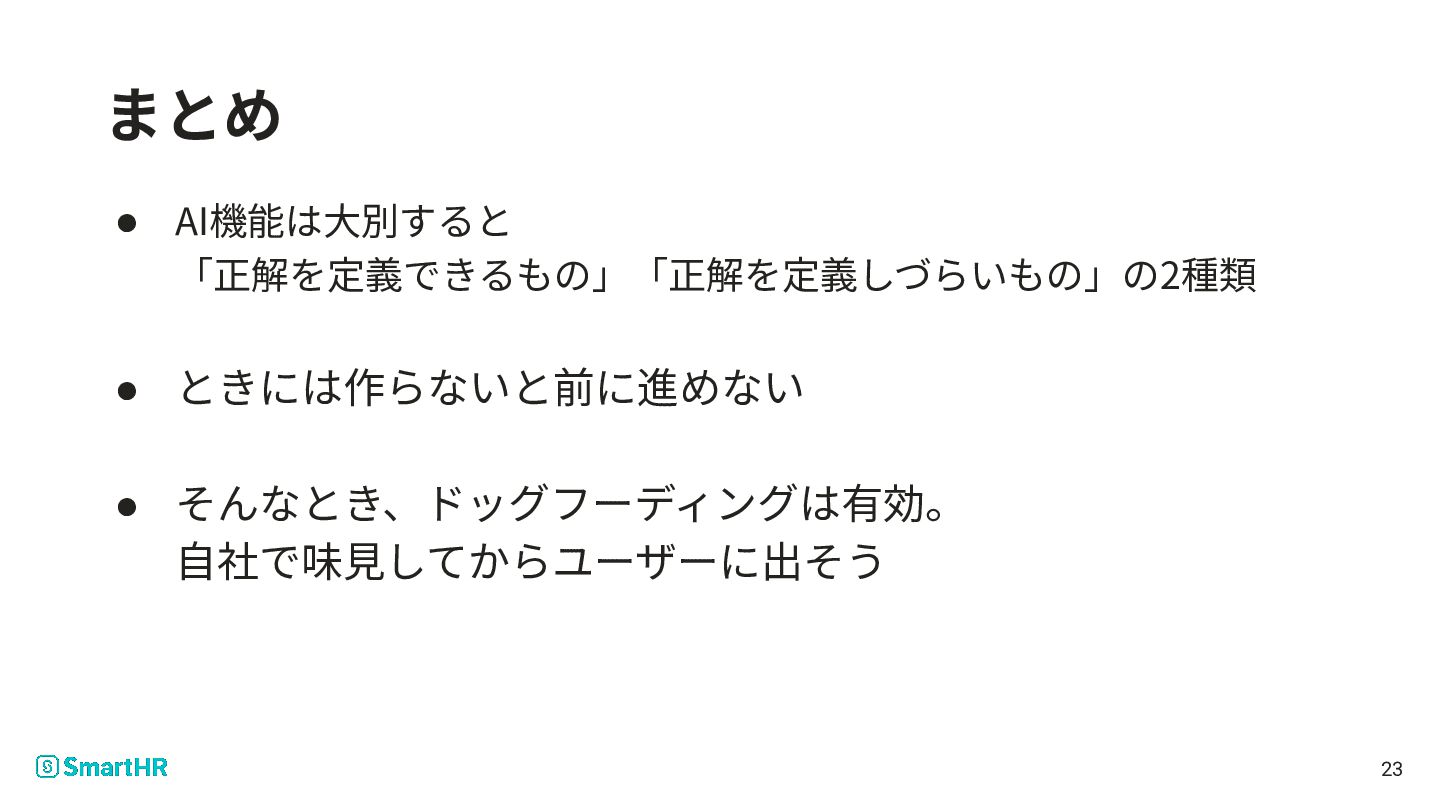 まとめ 23 • AI機能は⼤別すると 「正解を定義できるもの」「正解を定義しづらいもの」の2種類 • ときには作らないと前に進めない • そんなとき、ドッグフーディングは有効。 ⾃社で味⾒してからユーザーに出そう