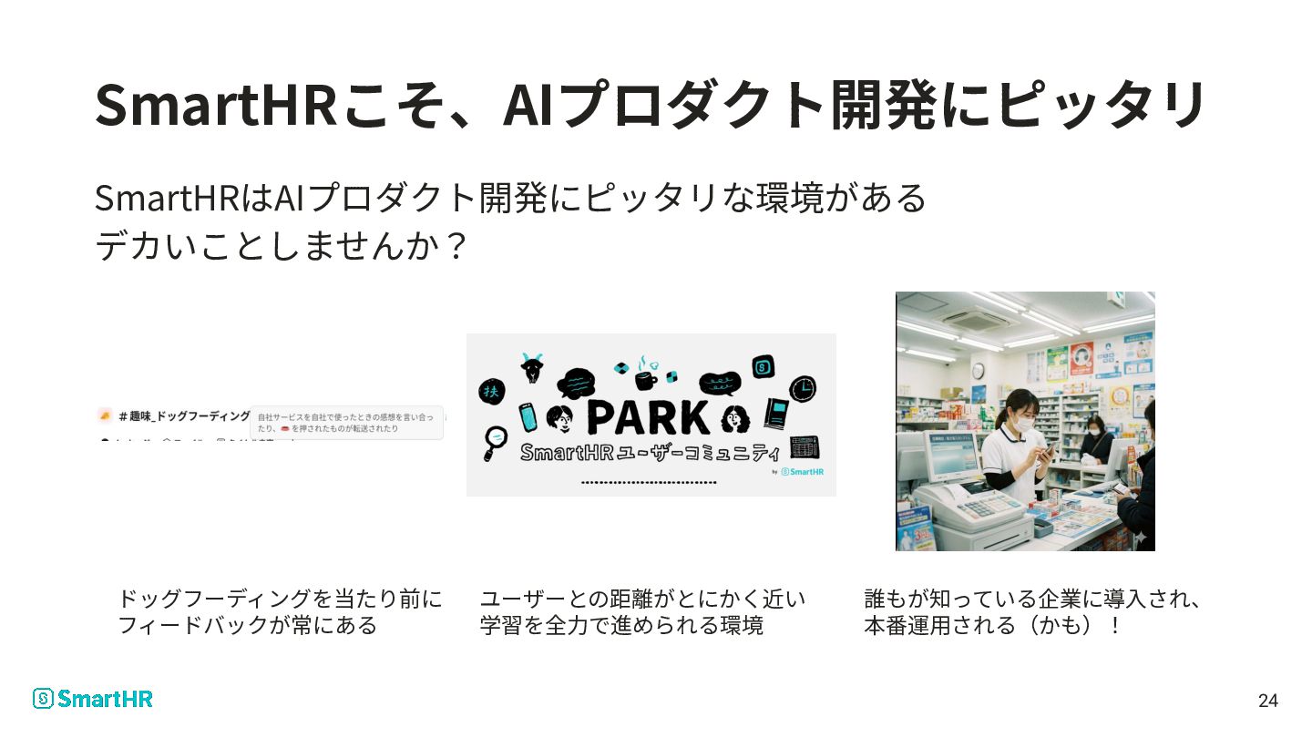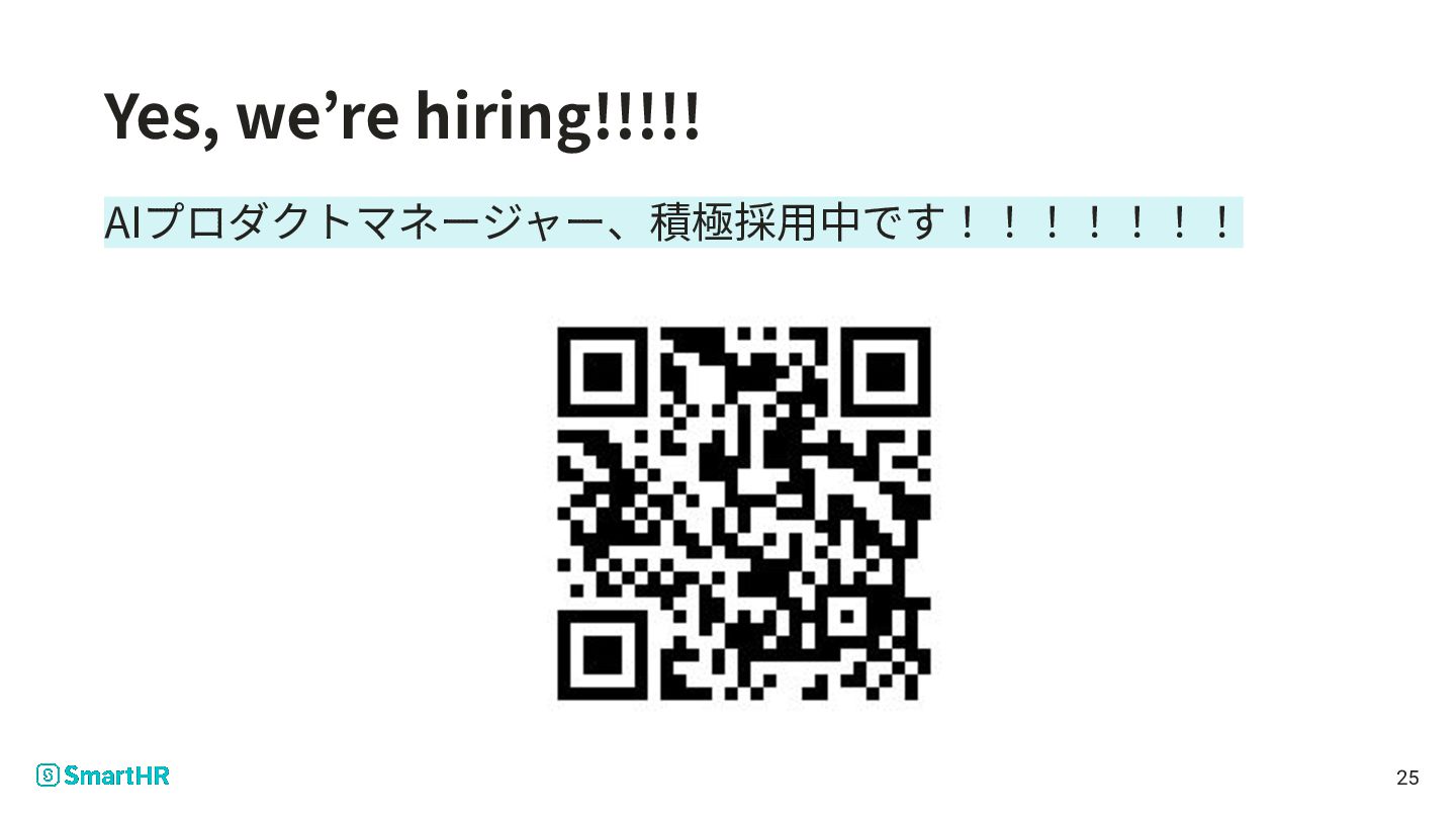 SmartHRこそ、AIプロダクト開発にピッタリ 24 SmartHRはAIプロダクト開発にピッタリな環境がある デカいことしませんか? ドッグフーディングを当たり前に フィードバックが常にある ユーザーとの距離がとにかく近い 学習を全⼒で進められる環境 誰もが知っている企業に導⼊され、 本番運⽤される(かも)!
