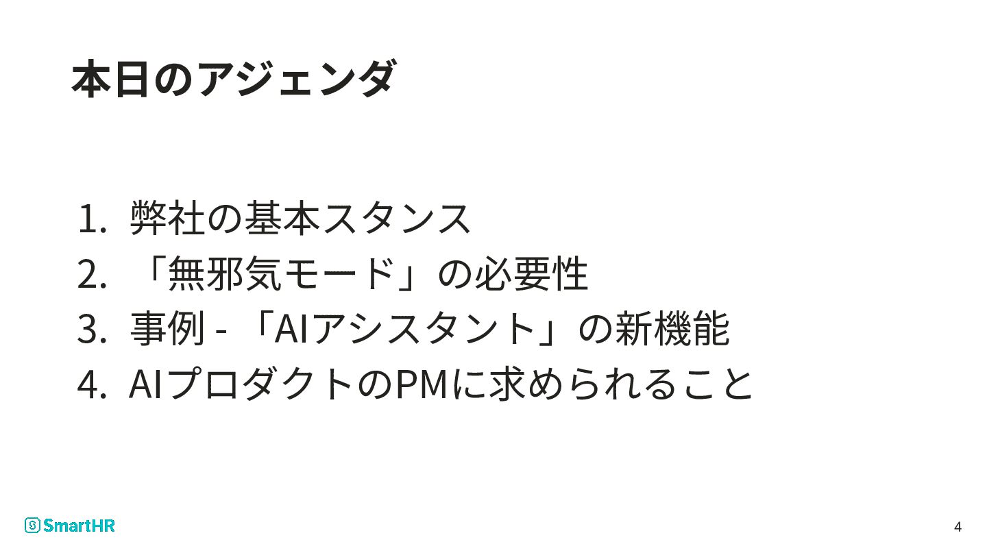 本⽇のアジェンダ 4 1. 弊社の基本スタンス 2. 「無邪気モード」の必要性 3. 事例 - 「AIアシスタント」の新機能
