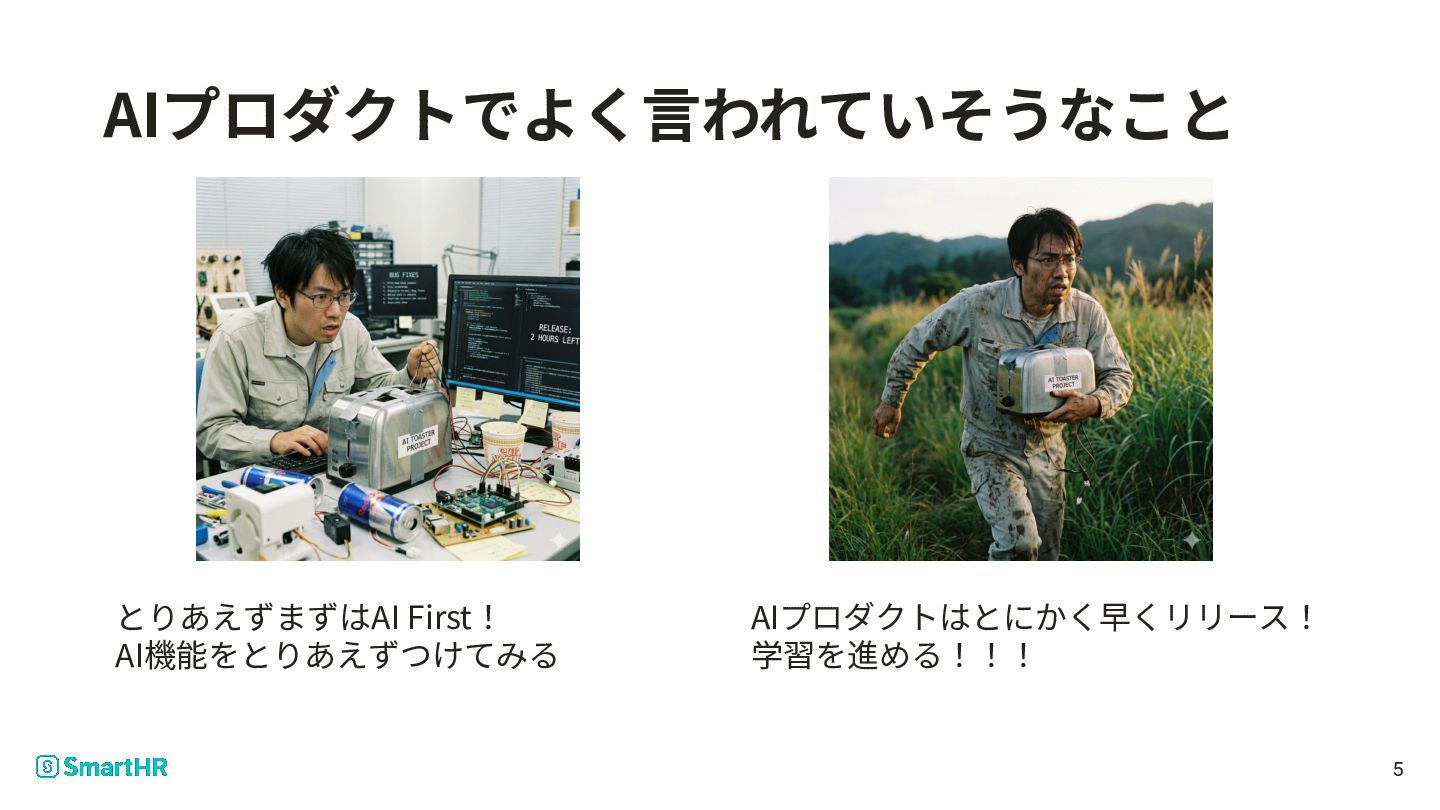 AIプロダクトでよく⾔われていそうなこと 5 とりあえずまずはAI First! AI機能をとりあえずつけてみる AIプロダクトはとにかく早くリリース! 学習を進める!!!
