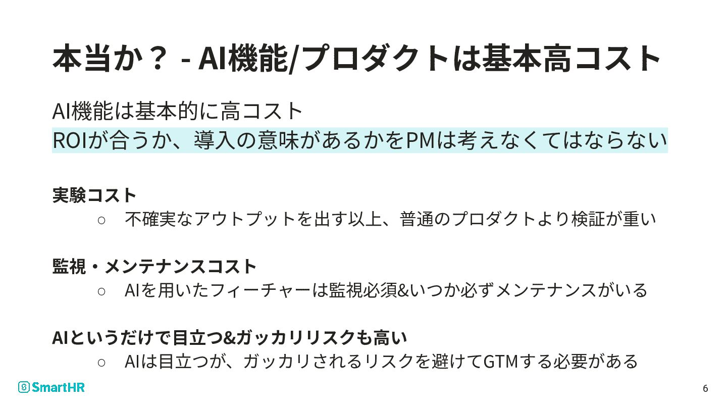 本当か? - AI機能/プロダクトは基本⾼コスト 6 AI機能は基本的に⾼コスト ROIが合うか、導⼊の意味があるかをPMは考えなくてはならない 実験コスト ◦ 不確実なアウトプットを出す以上、普通のプロダクトより検証が重い 監視‧メンテナンスコスト