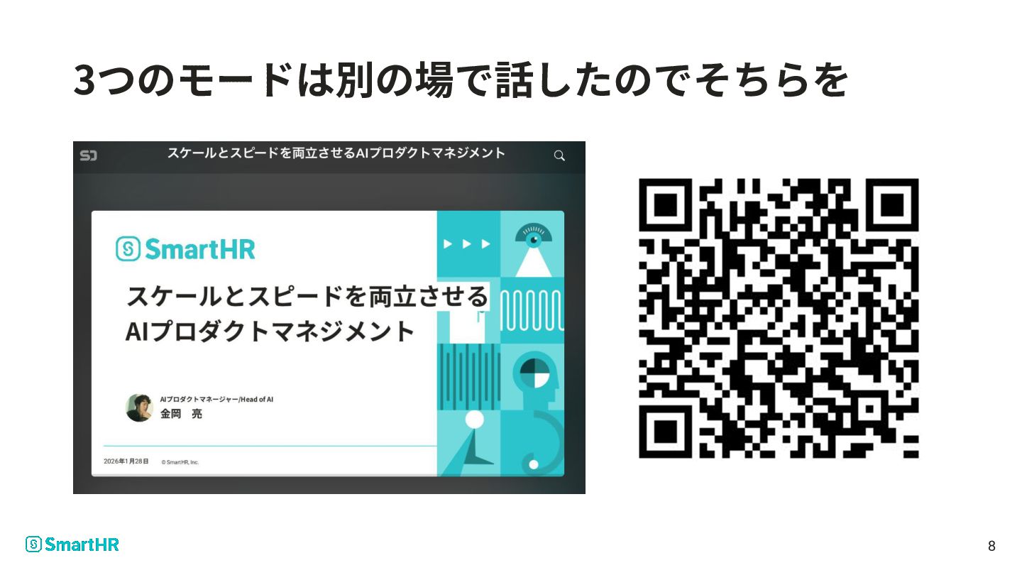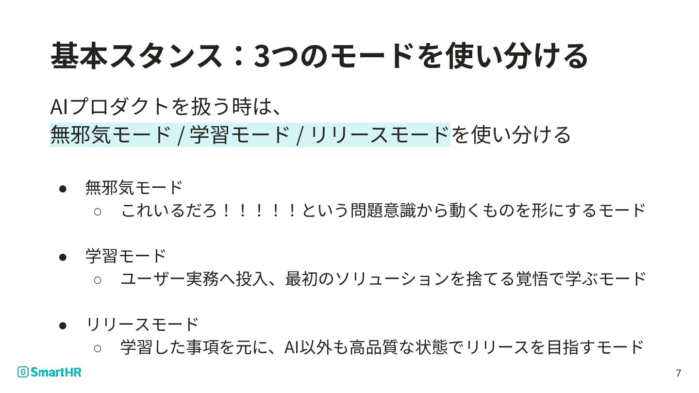基本スタンス:3つのモードを使い分ける 7 AIプロダクトを扱う時は、 無邪気モード / 学習モード / リリースモードを使い分ける • 無邪気モード