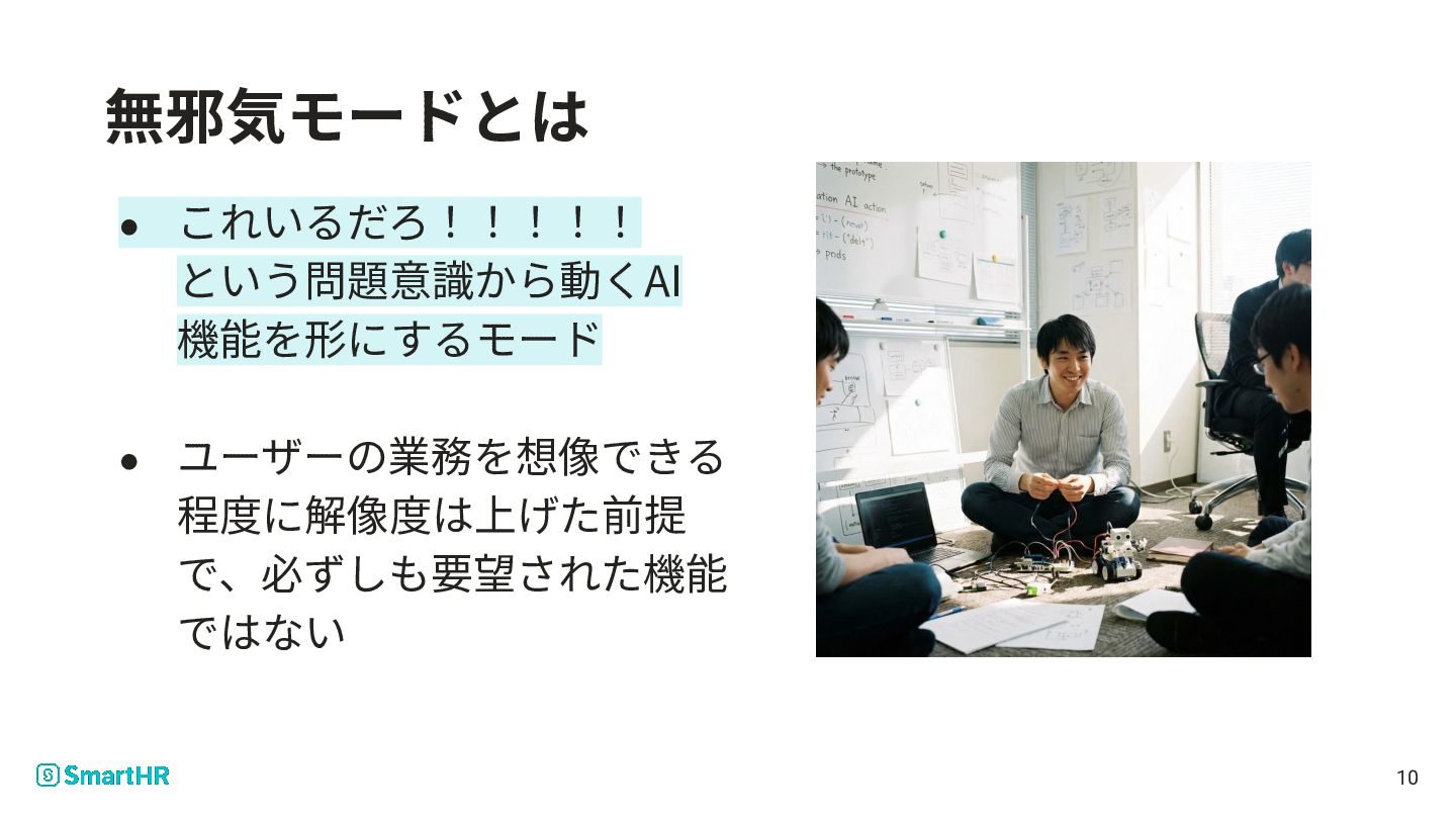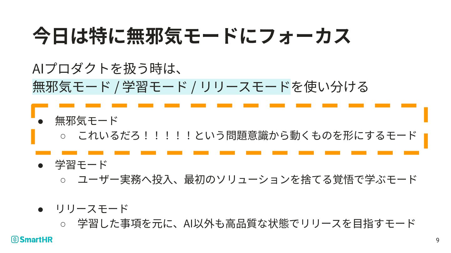 9 今⽇は特に無邪気モードにフォーカス AIプロダクトを扱う時は、 無邪気モード / 学習モード / リリースモードを使い分ける • 無邪気モード