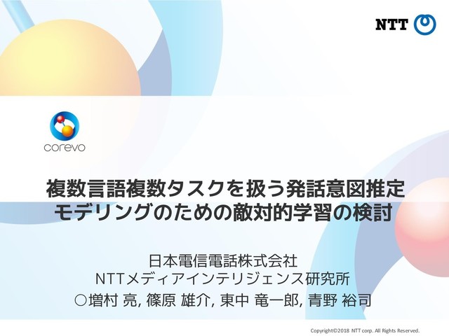 −1 …… …… EMBED BLSTM SOTMAX ATTENTION 1 2 −1 1 2 −1 BLSTM ℎ = − =1 || log ( | , ) 誤差を逆伝搬 することで、 パラメータを 最適化 入力: トークン系列 = {1 , … , } 本研究では、BLSTM-RNNとAttention機構を用いた 文分類のネットワーク構造を採用 [Yang+ 2016] 出力: ラベル事後確率 = {(1 |), … , ( |)} 学習時の誤差 単言語・単タスクを扱うモデル化と学習