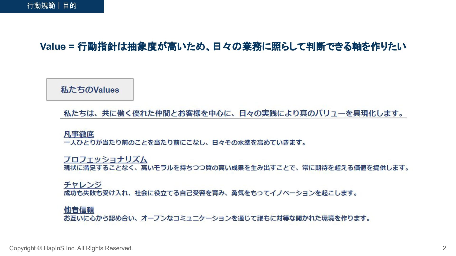 Copyright © HapInS Inc. All Rights Reserved. 2 行動規範|目的 Value