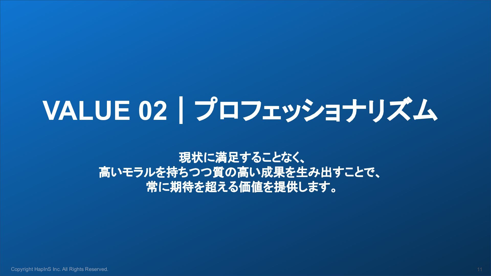 Copyright HapInS Inc. All Rights Reserved. 現状に満足することなく、 高いモラルを持ちつつ質の高い成果を生み出すことで、 常に期待を超える価値を提供します。 VALUE