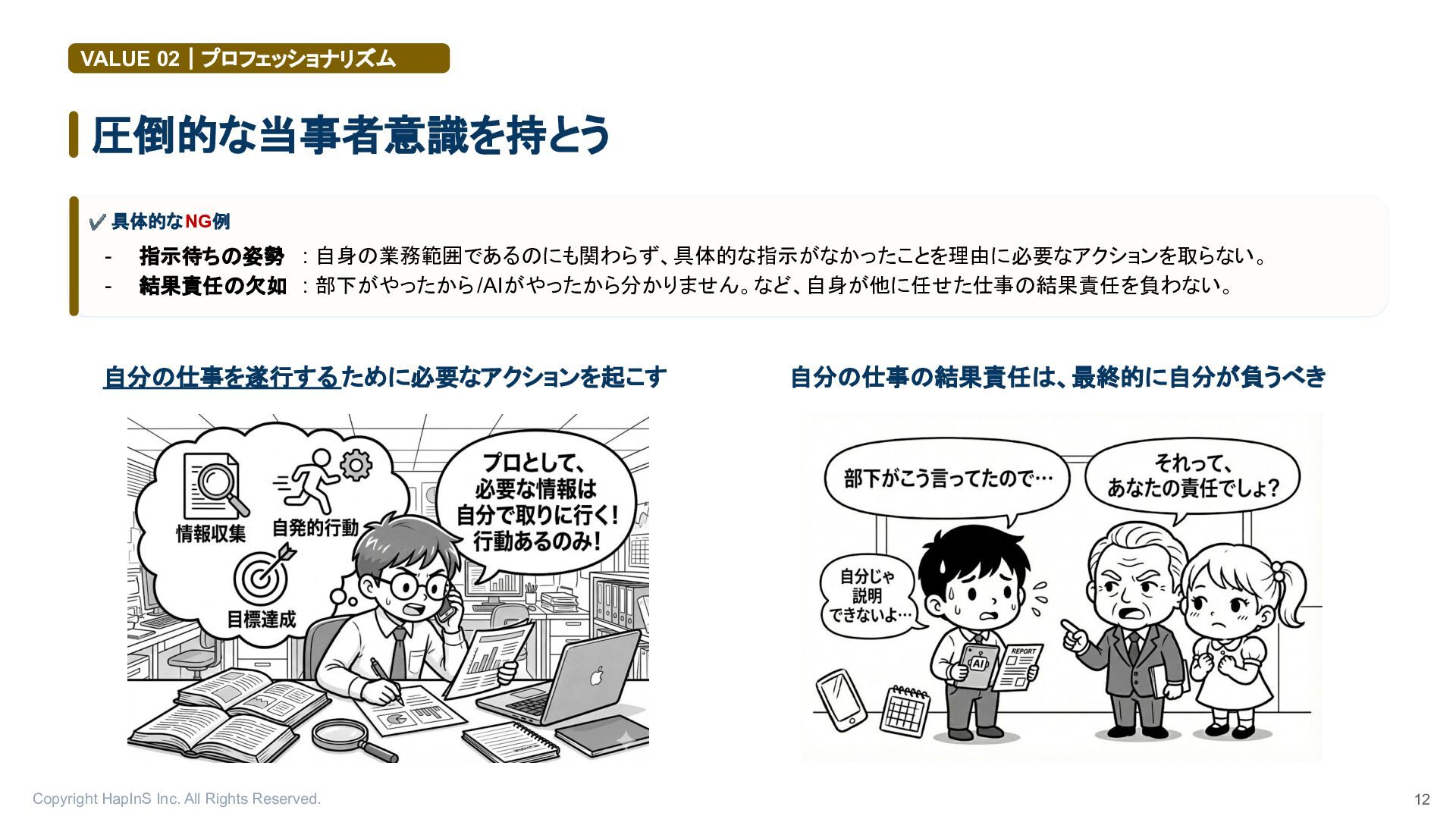 圧倒的な当事者意識を持とう 12 Copyright HapInS Inc. All Rights Reserved. VALUE 02|プロフェッショナリズム 自分の仕事を遂行する ために必要なアクションを起こす 自分の仕事の結果責任は、最終的に自分が負うべき