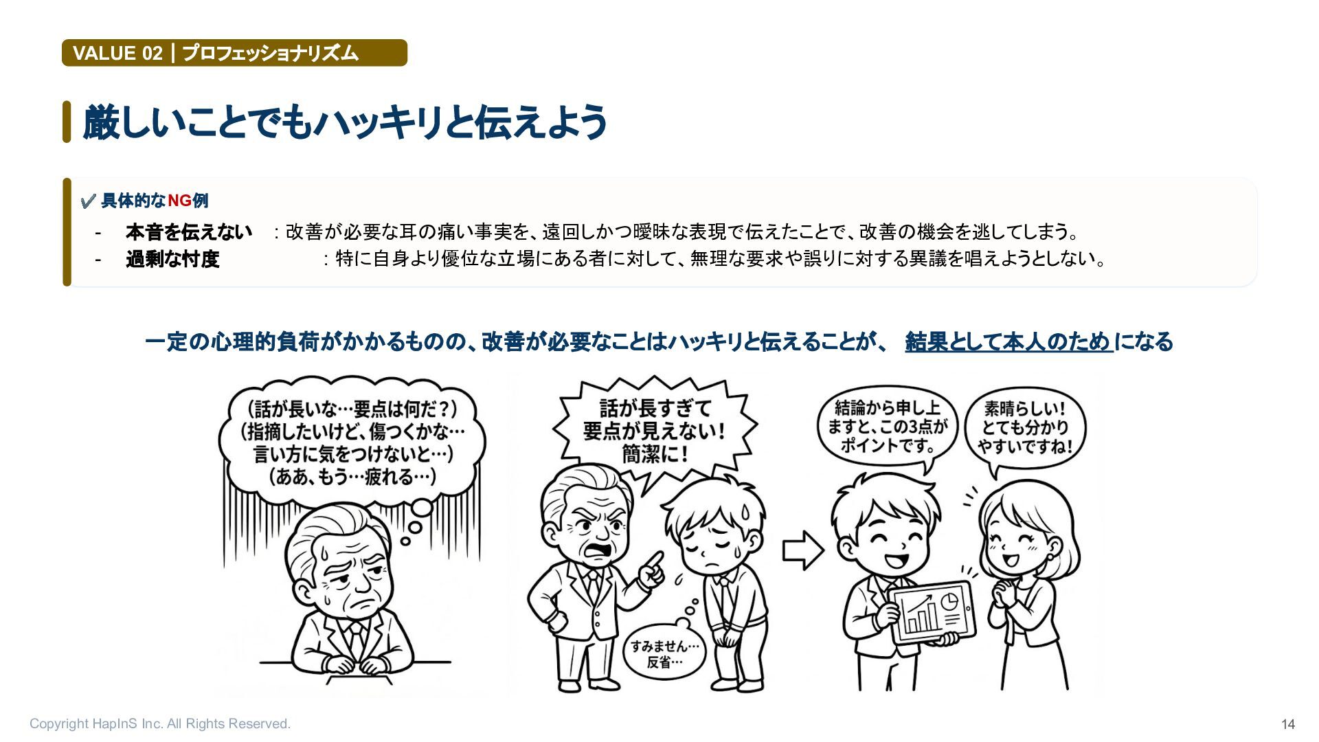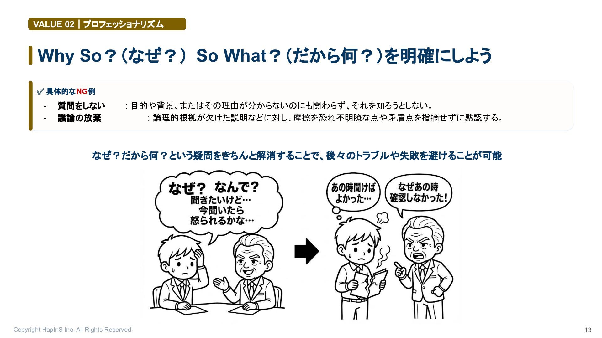 Why So?(なぜ?) So What?(だから何?)を明確にしよう 13 Copyright HapInS Inc. All Rights Reserved. VALUE 02|プロフェッショナリズム なぜ?だから何?という疑問をきちんと解消することで、後々のトラブルや失敗を避けることが可能