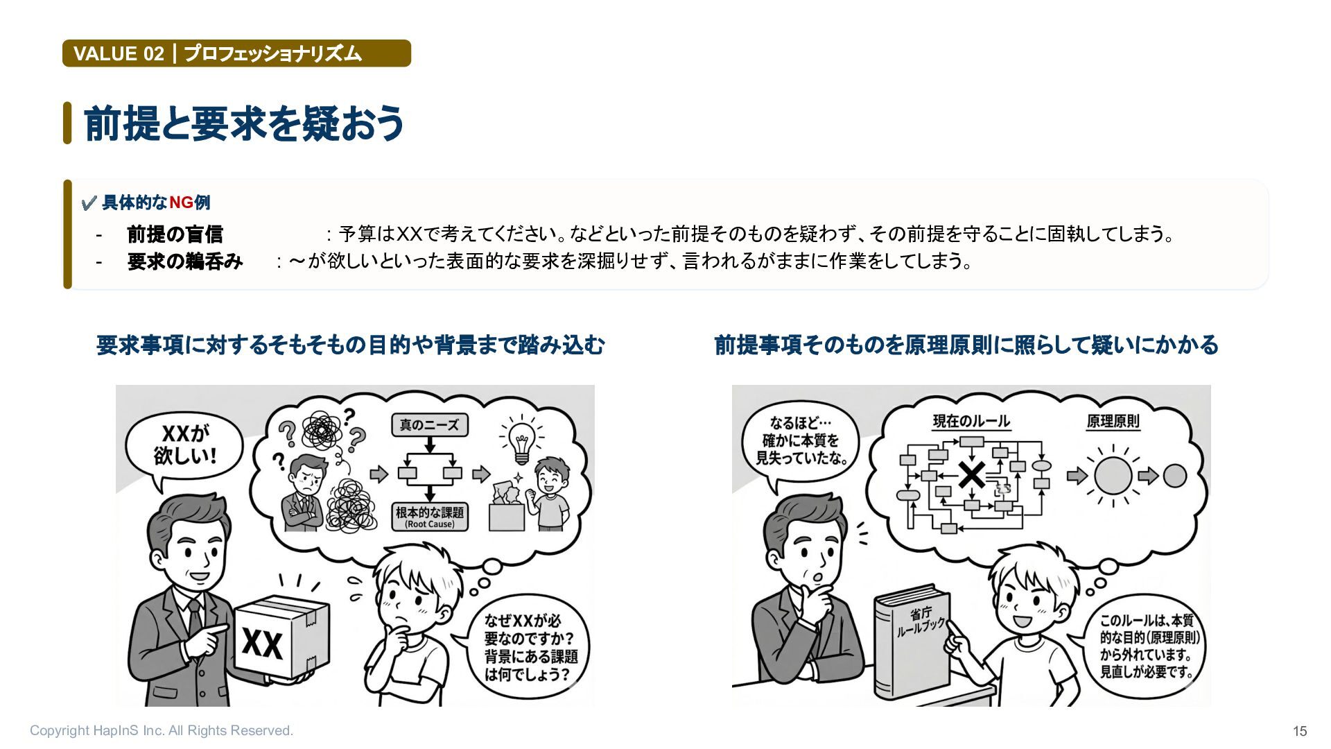 前提と要求を疑おう 15 Copyright HapInS Inc. All Rights Reserved. VALUE 02|プロフェッショナリズム 要求事項に対するそもそもの目的や背景まで踏み込む 前提事項そのものを原理原則に照らして疑いにかかる