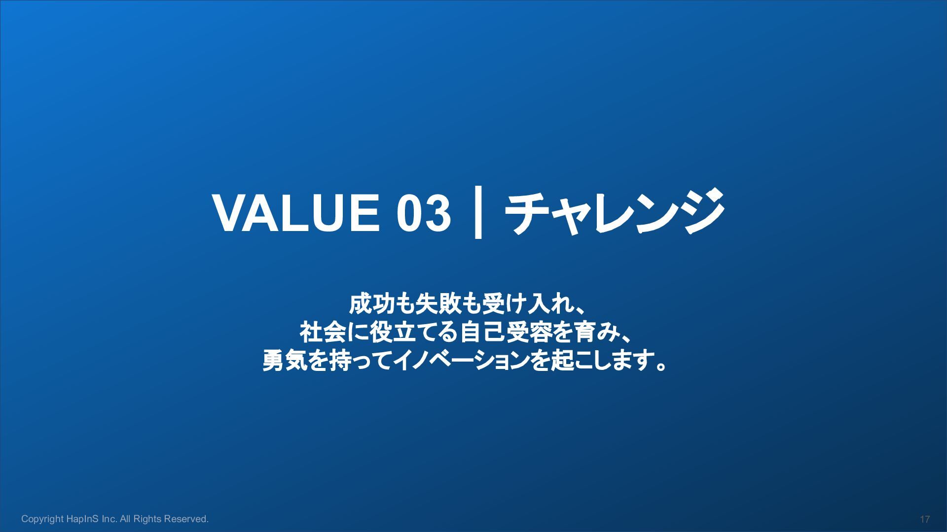 Copyright HapInS Inc. All Rights Reserved. 成功も失敗も受け入れ、 社会に役立てる自己受容を育み、 勇気を持ってイノベーションを起こします。 VALUE