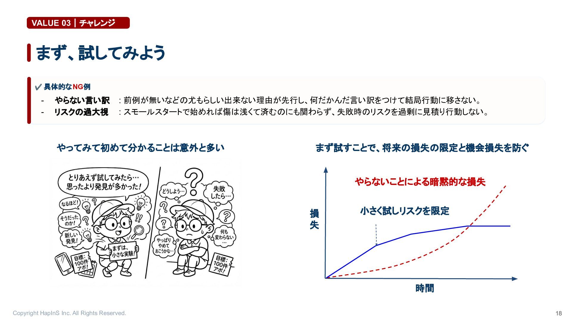 まず、試してみよう 18 Copyright HapInS Inc. All Rights Reserved. VALUE 03|チャレンジ 時間 損 失 まず試すことで、将来の損失の限定と機会損失を防ぐ やらないことによる暗黙的な損失 小さく試しリスクを限定 やってみて初めて分かることは意外と多い