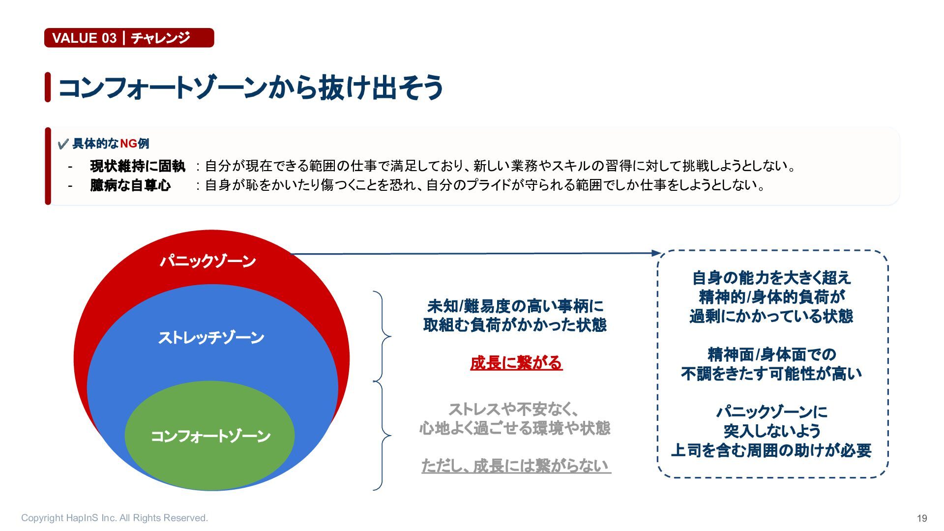 コンフォートゾーンから抜け出そう 19 Copyright HapInS Inc. All Rights Reserved. VALUE 03|チャレンジ コンフォートゾーン ストレッチゾーン パニックゾーン ストレスや不安なく、 心地よく過ごせる環境や状態 ただし、成長には繋がらない 未知/難易度の高い事柄に 取組む負荷がかかった状態 成長に繋がる 自身の能力を大きく超え 精神的/身体的負荷が 過剰にかかっている状態 精神面/身体面での 不調をきたす可能性が高い パニックゾーンに 突入しないよう 上司を含む周囲の助けが必要